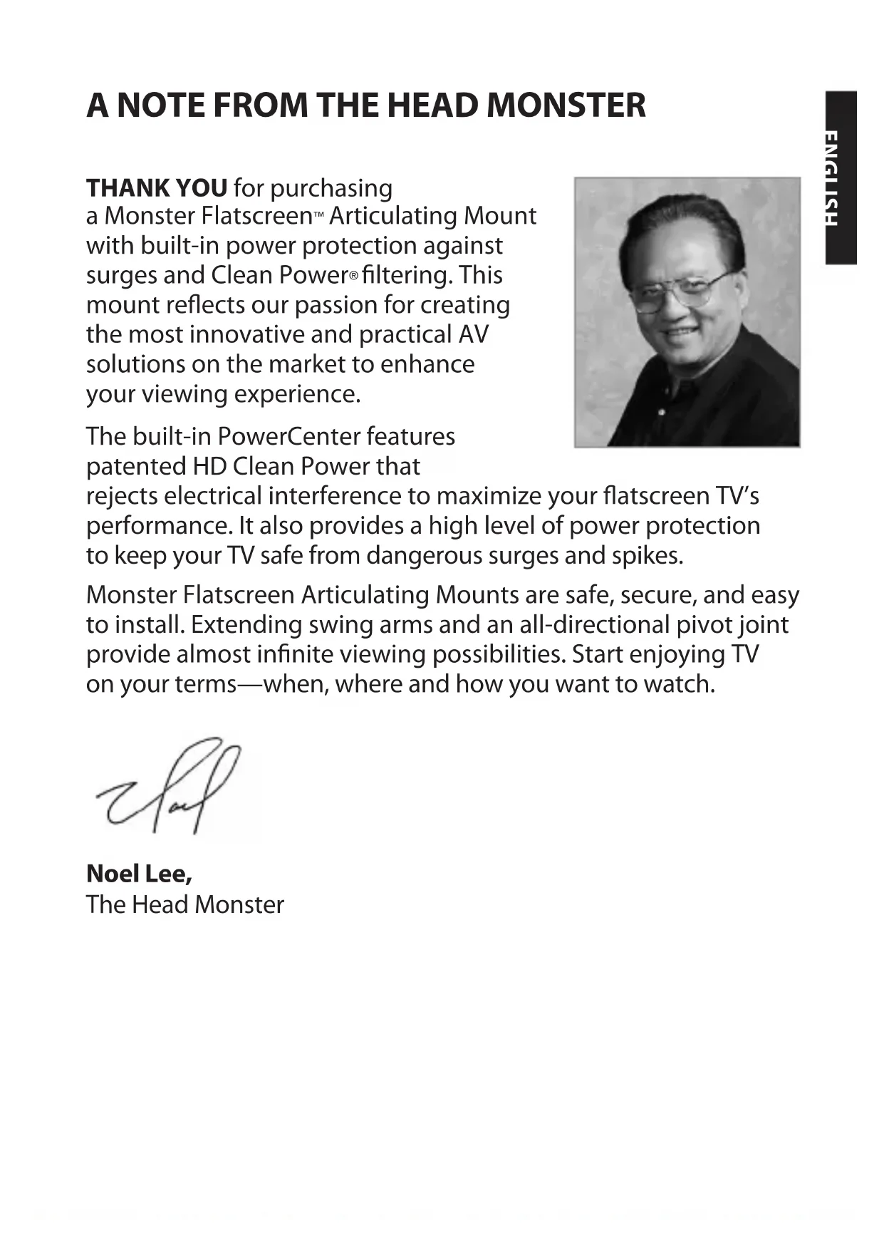 ltering. This mount reects our passion for creating the most innovative and practical AV solutions on the market to enhance your viewing experience. The built-in PowerCenter features patented HD Clean Power that rejects electrical interference to maximize your atscreen TV’s performance. It also provides a high level of power protection to keep your TV safe from dangerous surges and spikes. Monster Flatscreen Articulating Mounts are safe, secure, and easy to install. Extending swing arms and an all-directional pivot joint provide almost innite viewing possibilities. Start enjoying TV on your terms—when, where and how you want to watch. Noel Lee, The Head MonsterENGLISH More Great Products from Monster FlatScreen