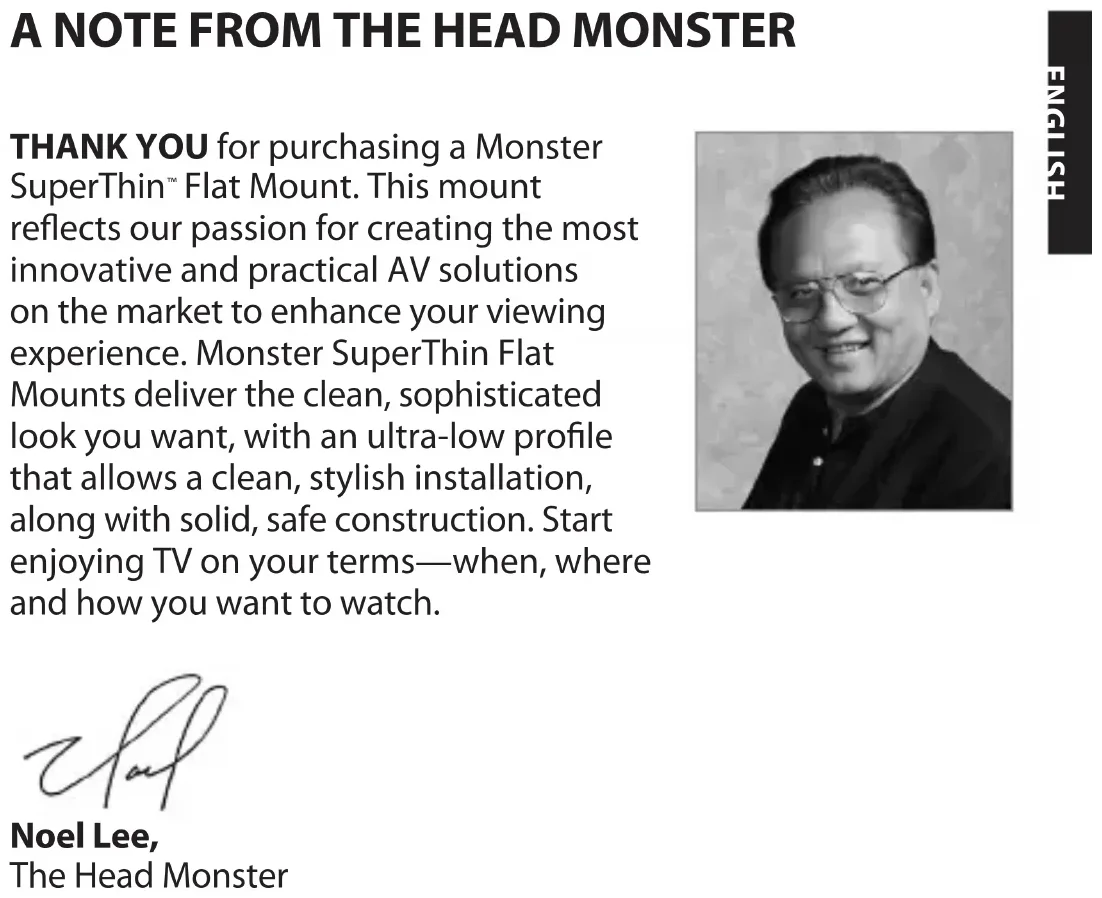 Flat Mount. This mount reects our passion for creating the most innovative and practical AV solutions on the market to enhance your viewing experience. Monster SuperThin Flat Mounts deliver the clean, sophisticated look you want, with an ultra-low prole that allows a clean, stylish installation, along with solid, safe construction. Start enjoying TV on your terms—when, where and how you want to watch. Noel Lee, The Head MonsterENGLISH More Great Products from Monster FlatScreen