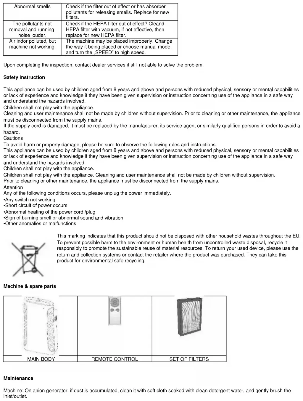 - Other anomalies or malfunctions This marking indicates that this product should not be disposed with other household wastes throughout the EU. To prevent possible harm to the environment or human health from uncontrolled waste disposal, recycle it responsibly to promote the sustainable reuse of material resources. To return your used device, please use the return and collection systems or contact the retailer where the product was purchased. They can take this product for environmental safe recycling. Machine & spare parts