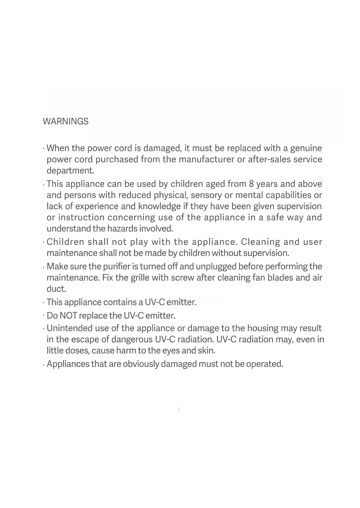 When the power cord is damaged, it must be replaced with a genuine power cord purchased from the manufacturer or after-sales service department. This appliance can be used by children aged from 8 years and above and persons with reduced physical, sensory or mental capabilities or lack of experience and knowledge if they have been given supervision or instruction concerning use of the appliance in a safe way and understand the hazards involved. Children shall not play with the appliance. Cleaning and user maintenance shall not be made by children without supervision. Make sure the purifier is turned off and unplugged before performing the maintenance. Fix the grille with screw after cleaning fan blades and air duct. This appliance contains a UV-C emitter. Do NOT replace the UV-C emitter. Unintended use of the appliance or damage to the housing may result in the escape of dangerous UV-C radiation. UV-C radiation may, even in little doses, cause harm to the eyes and skin. Appliances that are obviously damaged must not be operated.2 Precautions
