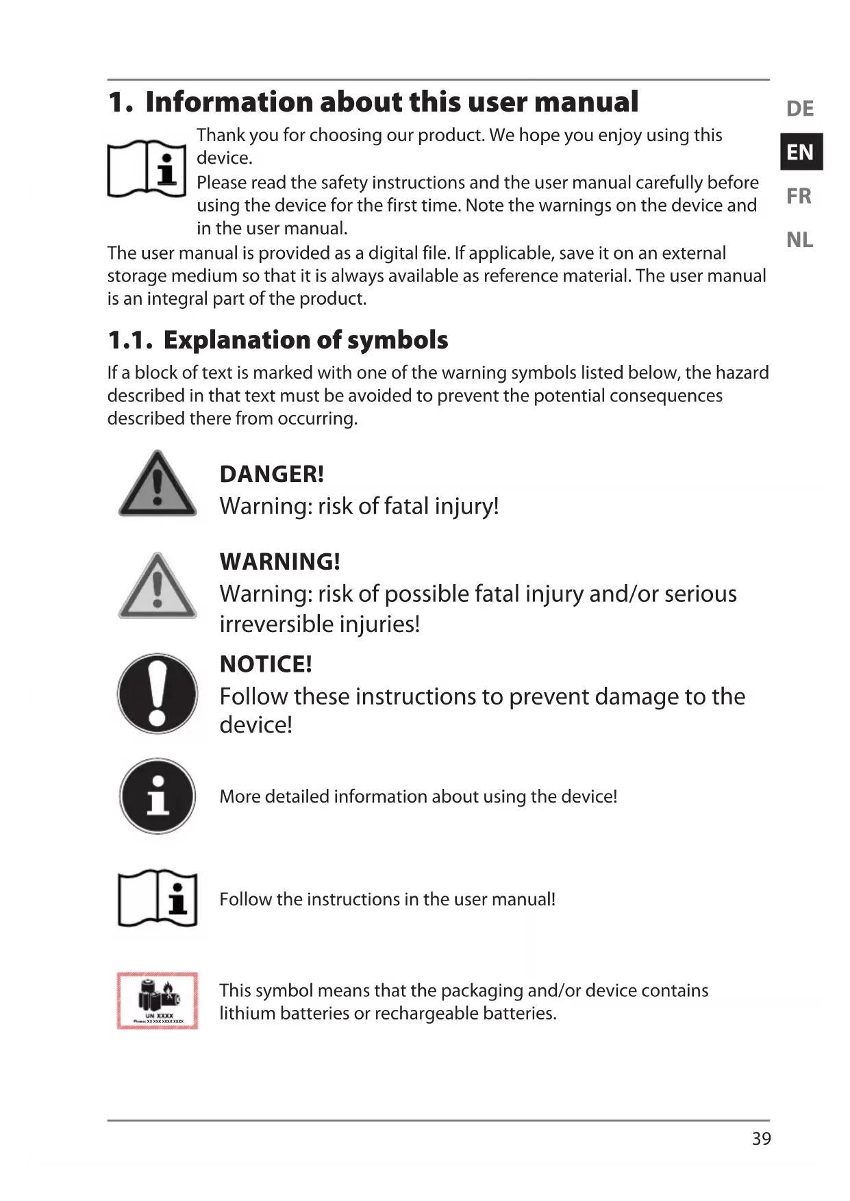 Thank you for choosing our product. We hope you enjoy using this device. Please read the safety instructions and the user manual carefully before using the device for the first time. Note the warnings on the device and in the user manual. The user manual is provided as a digital file. If applicable, save it on an external storage medium so that it is always available as reference material. The user manual is an integral part of the product. 1.1. Explanation of symbols If a block of text is marked with one of the warning symbols listed below, the hazard described in that text must be avoided to prevent the potential consequences described there from occurring. DANGER!