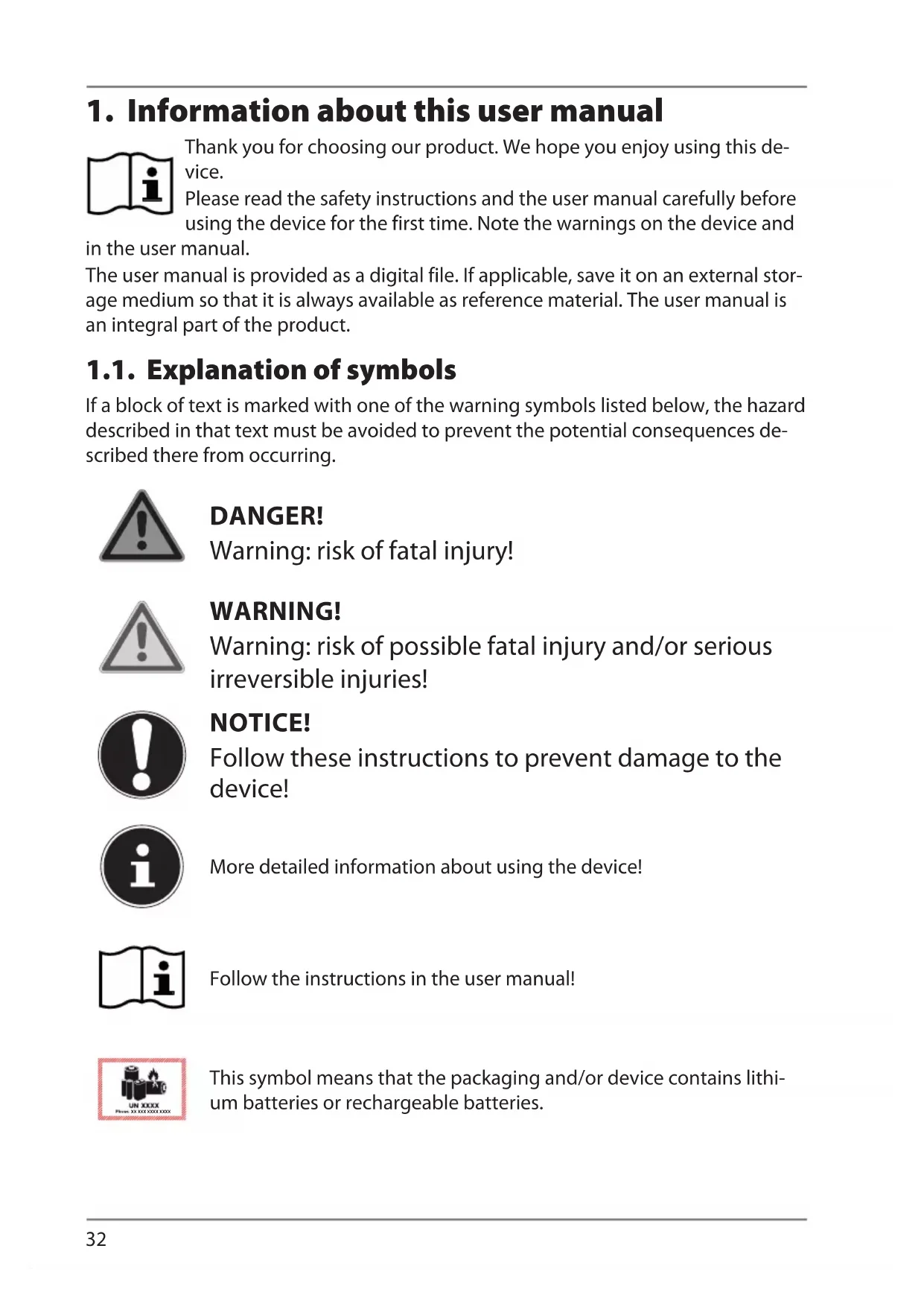 Thank you for choosing our product. We hope you enjoy using this de- vice. Please read the safety instructions and the user manual carefully before using the device for the first time. Note the warnings on the device and in the user manual. The user manual is provided as a digital file. If applicable, save it on an external stor- age medium so that it is always available as reference material. The user manual is an integral part of the product. 1.1. Explanation of symbols If a block of text is marked with one of the warning symbols listed below, the hazard described in that text must be avoided to prevent the potential consequences de- scribed there from occurring. DANGER!