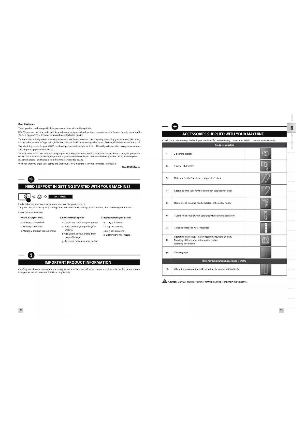 Dear Customer, Thank you for purchasing a KRUPS espresso machine with built-in grinder. KRUPS espresso machines with built-in grinders are designed, developed and manufactured in France, thereby ensuring the strictest guarantees in terms of origin and manufacturing quality. Your machine is designed to be as easy to use as possible and to create barista-quality drinks. Enjoy an Espresso, a Ristretto, a long coee, or even a Cappuccino, Latte Macchiato or Caé Latte, among other types of coee, all at the touch of a button! To make things easier for you, KRUPS has developed an intuitive light indicator. This will guide you when using your machine and brighten up your coee breaks. Your KRUPS espresso machine is also equipped with a large intuitive touch screen, like a smartphone screen, for great ease of use. The advanced technologies present in your machine enable you to obtain the best possible result, revealing the maximum aromas and avours from freshly ground coee beans. We hope that you enjoy your coee and that your KRUPS machine is to your complete satisfaction. The KRUPS team NEED SUPPORT IN GETTING STARTED WITH YOUR MACHINE?