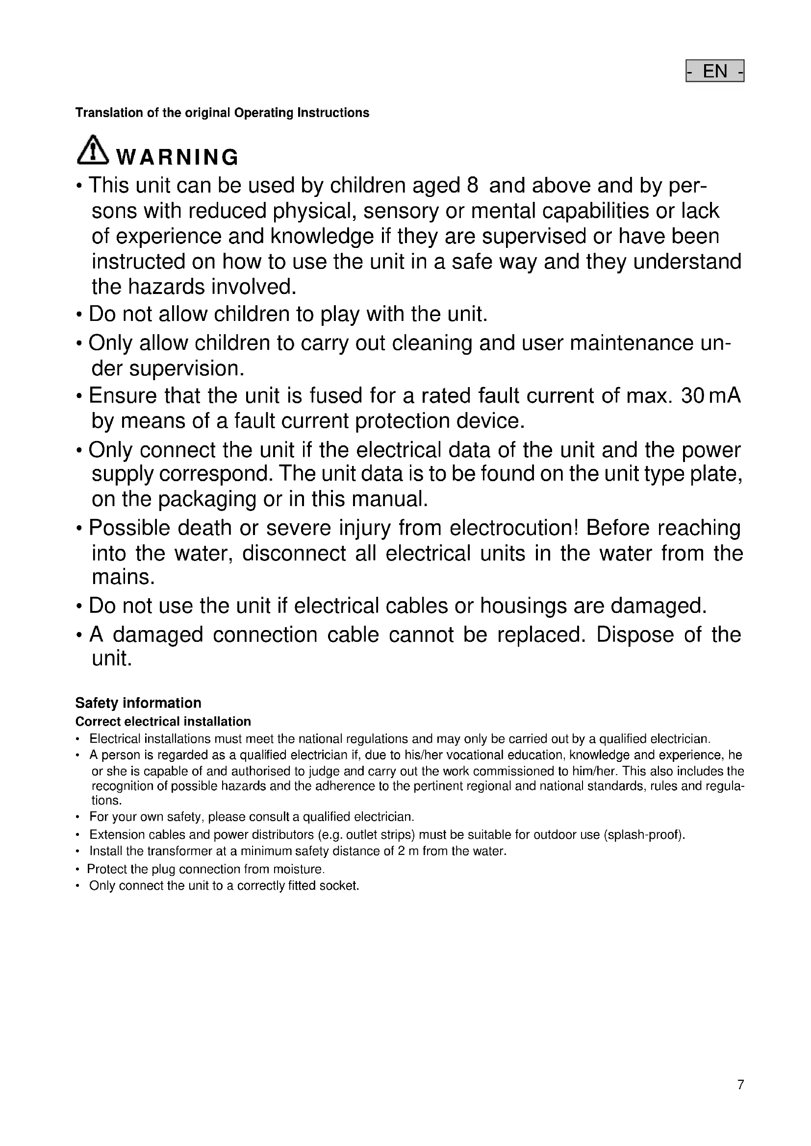 - Possible death or severe injury from electrocution! Before reaching into the water, disconnect all electrical units in the water from the mains.
