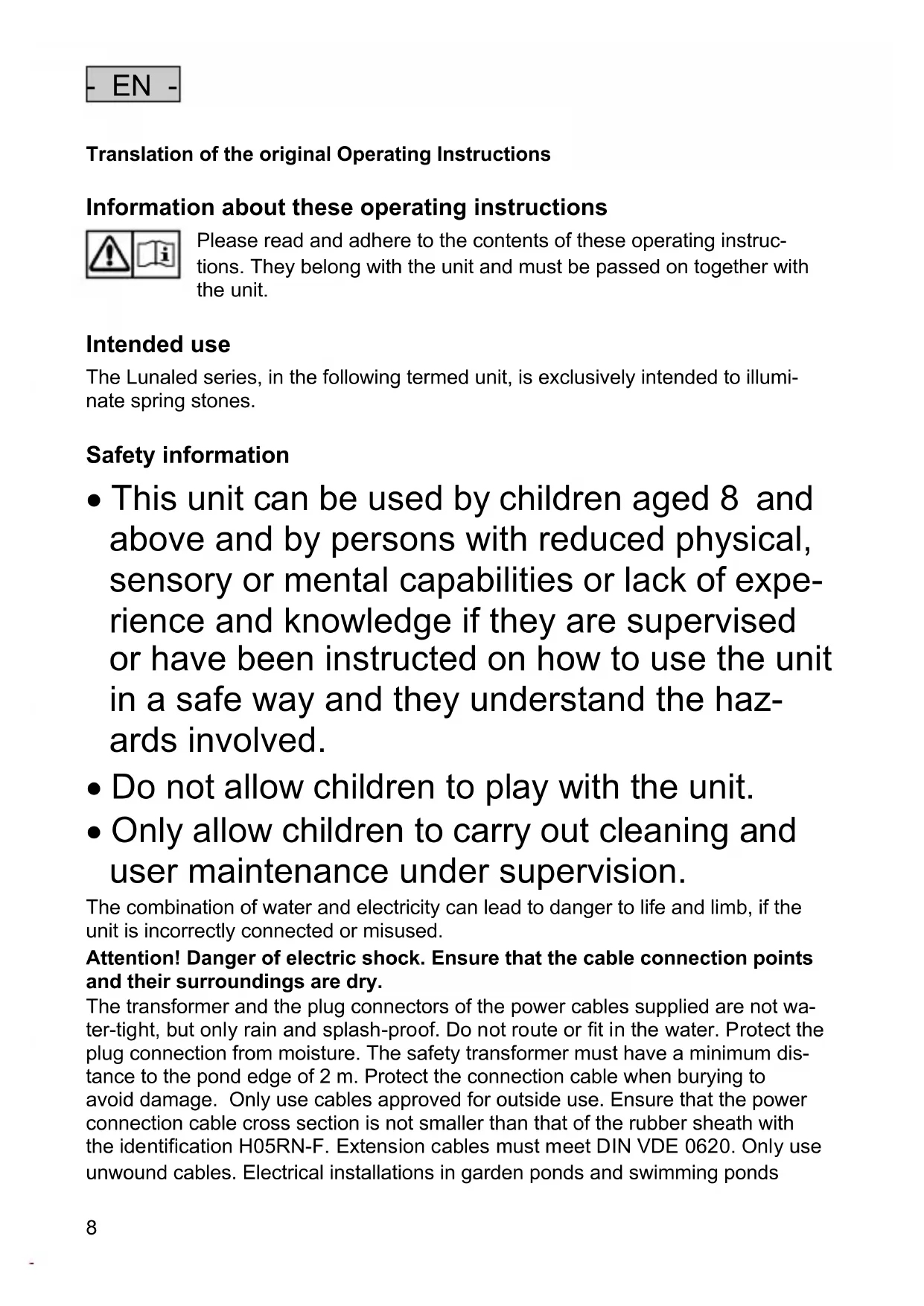 - Only allow children to carry out cleaning and user maintenance under supervision. The combination of water and electricity can lead to danger to life and limb, if the unit is incorrectly connected or misused. Attention! Danger of electric shock. Ensure that the cable connection points and their surroundings are dry. The transformer and the plug connectors of the power cables supplied are not wa- ter-tight, but only rain and splash-proof. Do not route or fit in the water. Protect the plug connection from moisture. The safety transformer must have a minimum dis- tance to the pond edge of 2 m. Protect the connection cable when burying to avoid damage. Only use cables approved for outside use. Ensure that the power connection cable cross section is not smaller than that of the rubber sheath with the identification H05RN-F. Extension cables must meet DIN VDE 0620. Only use unwound cables. Electrical installations in garden ponds and swimming ponds- EN -