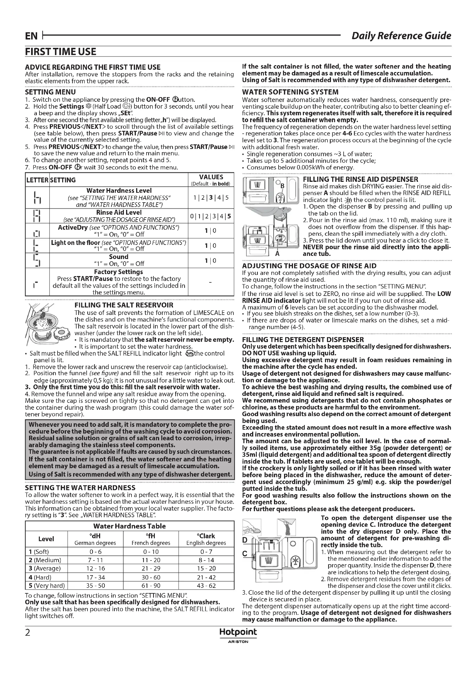 To allow the water softener to work in a perfect way, it is essential that the water hardness setting is based on the actual water hardness in your house. This information can be obtained from your local water supplier. The facto- ry setting is “3”. See „WATER HARDNESS TABLE”. Water Hardness Table Level °dH German degrees °fH French degrees°Clark English degrees 1 (Soft) 0 - 6 0 - 10 0 - 7 2 (Medium) 7 - 11 11 - 20 8 - 14 3 (Average) 12 - 16 21 - 29 15 - 20 4 (Hard) 17 - 34 30 - 60 21 - 42 5 (Very hard) 35 - 50 61 - 90 43 - 62 To change, follow instructions in section “SETTING MENU”.Only use salt that has been specically designed for dishwashers.After the salt has been poured into the machine, the SALT REFILL indicator light switches o.If the salt container is not lled, the water softener and the heating element may be damaged as a result of limescale accumulation.Using of Salt is recommended with any type of dishwasher detergent.