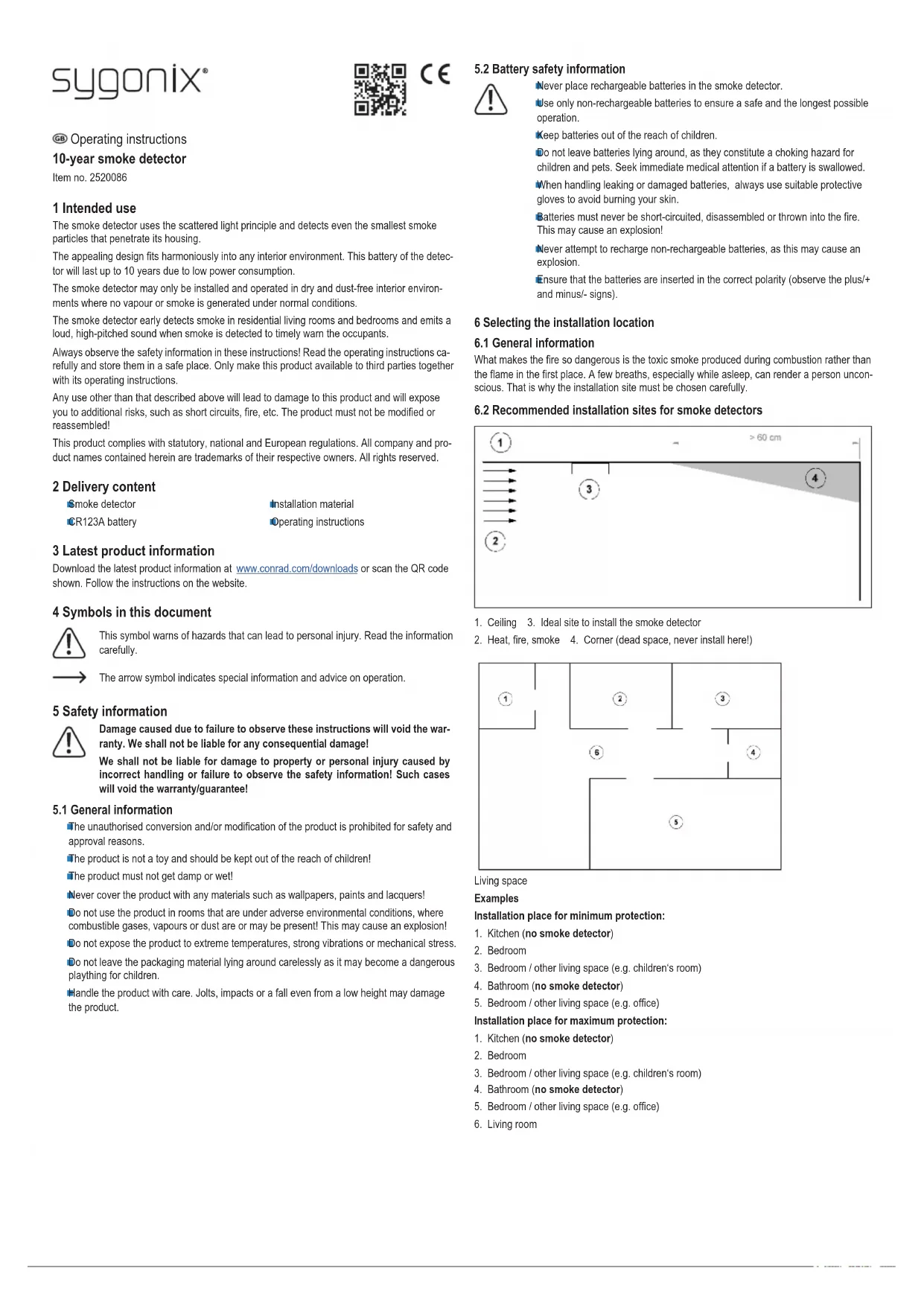 Operating instructions 10-year smoke detector Item no. 2520086 1 Intended use The smoke detector uses the scattered light principle and detects even the smallest smoke particles that penetrate its housing. The appealing design ts harmoniously into any interior environment. This battery of the detec- tor will last up to 10 years due to low power consumption. The smoke detector may only be installed and operated in dry and dust-free interior environ- ments where no vapour or smoke is generated under normal conditions. The smoke detector early detects smoke in residential living rooms and bedrooms and emits a loud, high-pitched sound when smoke is detected to timely warn the occupants. Always observe the safety information in these instructions! Read the operating instructions ca- refully and store them in a safe place. Only make this product available to third parties together with its operating instructions. Any use other than that described above will lead to damage to this product and will expose you to additional risks, such as short circuits, re, etc. The product must not be modied or reassembled! This product complies with statutory, national and European regulations. All company and pro- duct names contained herein are trademarks of their respective owners. All rights reserved. 2 Delivery content