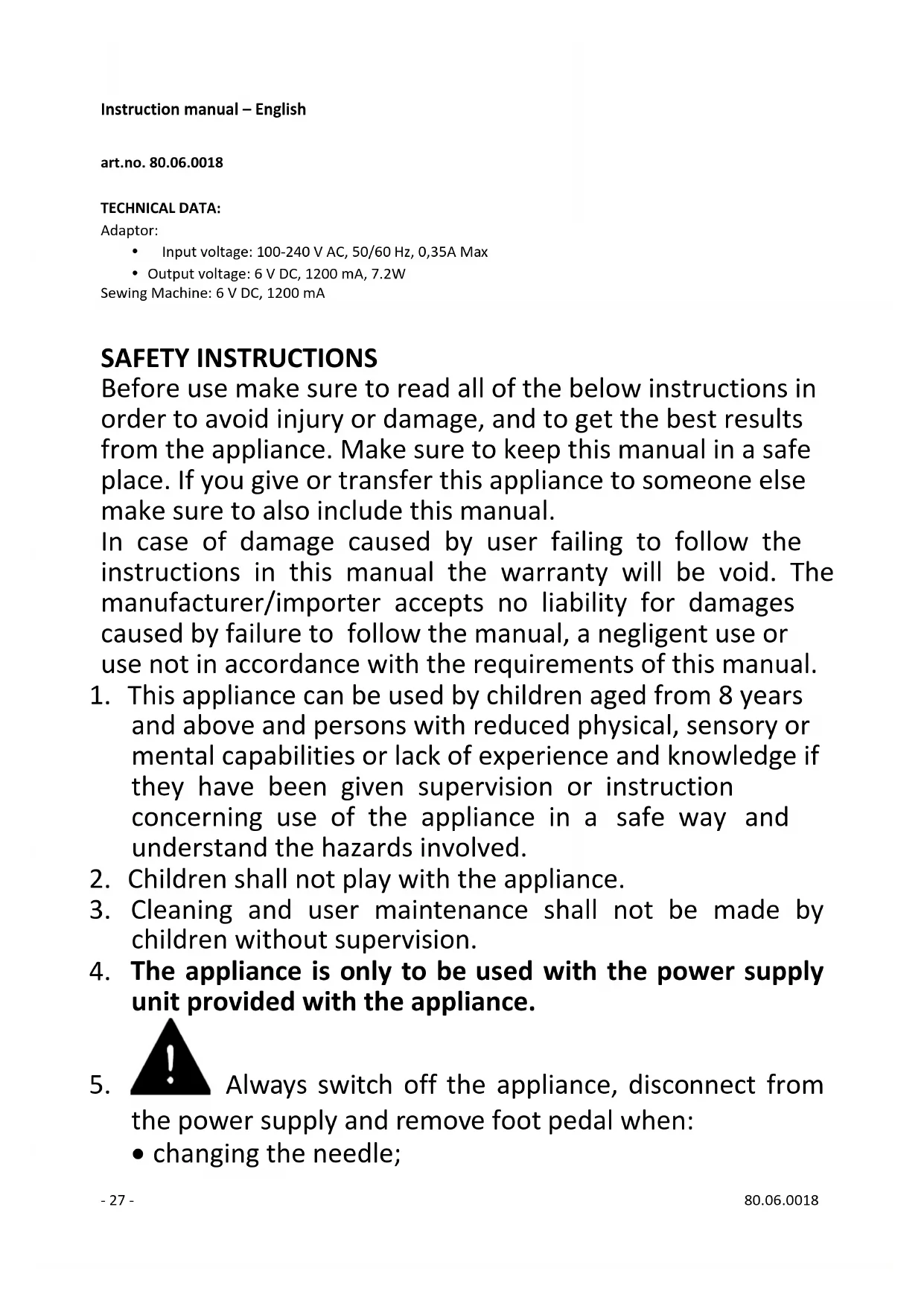 novembre 2019 Hema B.V. Boîte postale 37110 1030 AC Amsterdam Pays-Bas Ces conditions de garantie sont valables sans préjudice des droits légaux du client ou des actions intentées par lui.- 27 - 80.06.0018 Instruction manual – English art.no. 80.06.0018 TECHNICAL DATA: Adaptor: Input voltage: 100-240 V AC, 50/60 Hz, 0,35A Max Output voltage: 6 V DC, 1200 mA, 7.2W Sewing Machine: 6 V DC, 1200 mA SAFETY INSTRUCTIONS Before use make sure to read all of the below instructions in order to avoid injury or damage, and to get the best results from the appliance. Make sure to keep this manual in a safe place. If you give or transfer this appliance to someone else make sure to also include this manual. In case of damage caused by user failing to follow the instructions in this manual the warranty will be void. The manufacturer/importer accepts no liability for damages caused by failure to follow the manual, a negligent use or use not in accordance with the requirements of this manual.