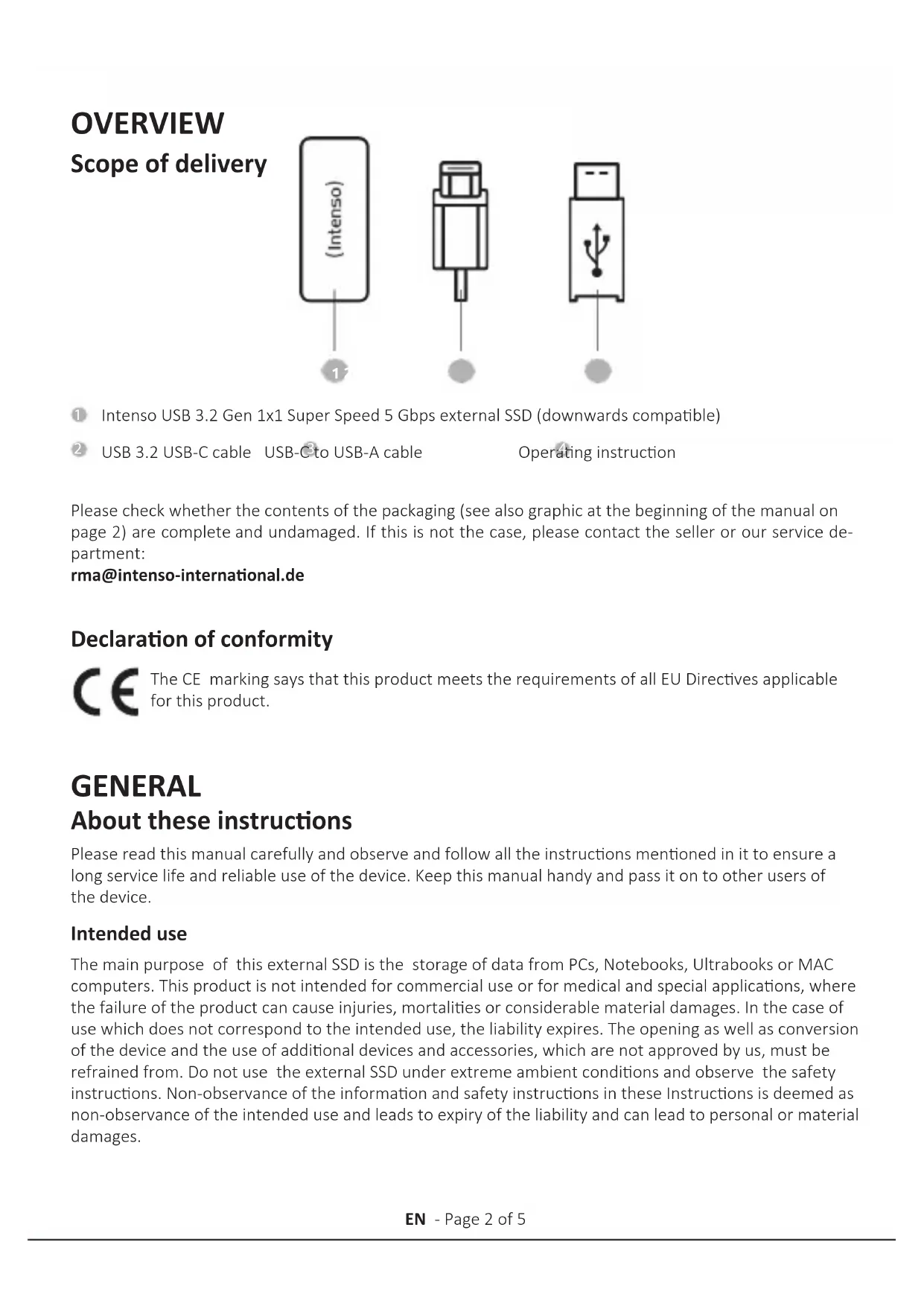 Please check whether the contents of the packaging (see also graphic at the beginning of the manual on page 2) are complete and undamaged. If this is not the case, please contact the seller or our service de- partment: rma@intenso-internaonal.de Declaraon of conformity The CE marking says that this product meets the requirements of all EU Direcves applicable for this product. GENERAL About these instrucons Please read this manual carefully and observe and follow all the instrucons menoned in it to ensure a long service life and reliable use of the device. Keep this manual handy and pass it on to other users of the device. Intended use The main purpose of this external SSD is the storage of data from PCs, Notebooks, Ultrabooks or MAC computers. This product is not intended for commercial use or for medical and special applicaons, where the failure of the product can cause injuries, mortalies or considerable material damages. In the case of use which does not correspond to the intended use, the liability expires. The opening as well as conversion of the device and the use of addional devices and accessories, which are not approved by us, must be refrained from. Do not use the external SSD under extreme ambient condions and observe the safety instrucons. Non-observance of the informaon and safety instrucons in these Instrucons is deemed as non-observance of the intended use and leads to expiry of the liability and can lead to personal or material damages. EN - Page 2 of 5