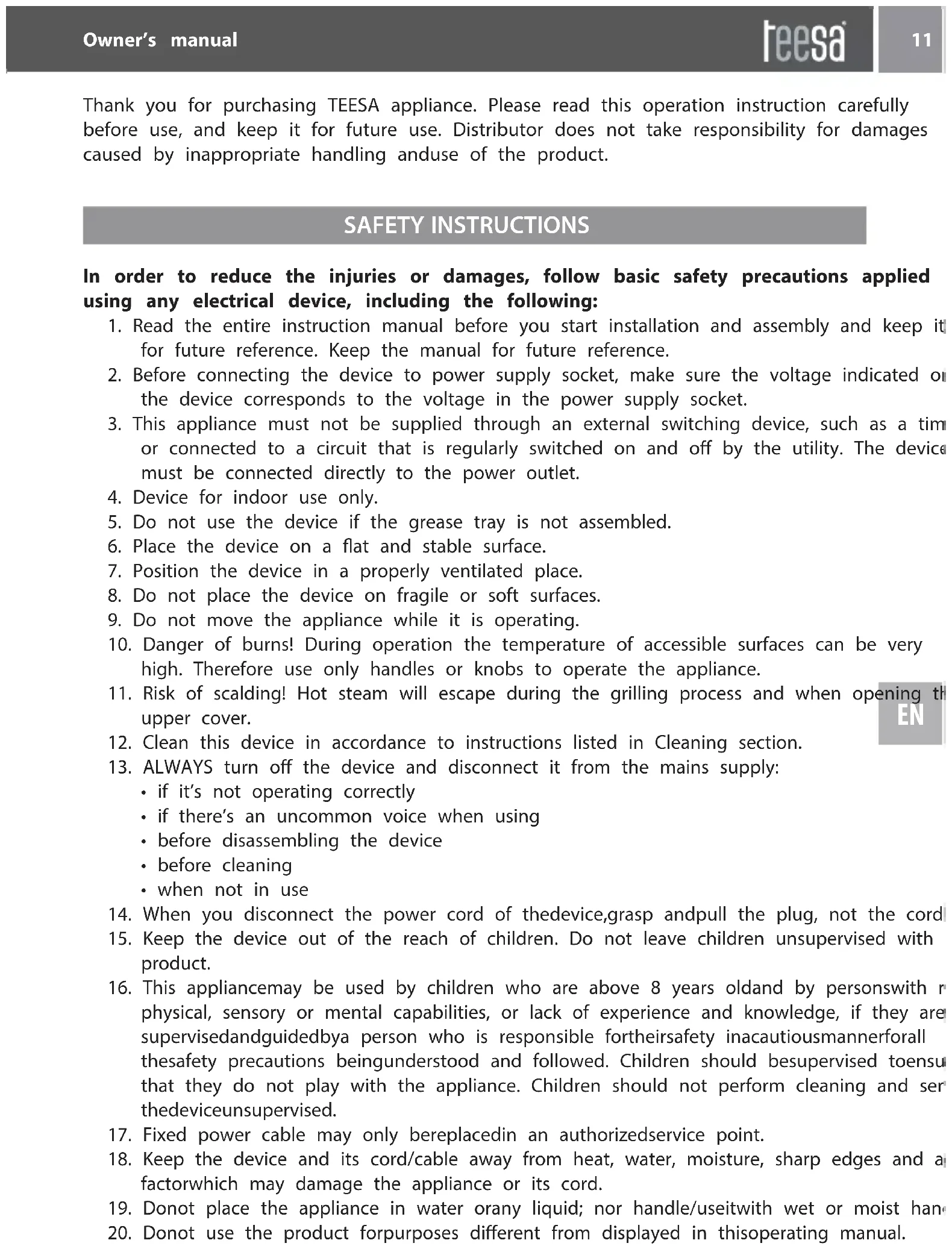 Thank you for purchasing TEESA appliance. Please read this operation instruction carefully before use, and keep it for future use. Distributor does not take responsibility for damages caused by inappropriate handling anduse of the product. 11Bedienungsanleitung