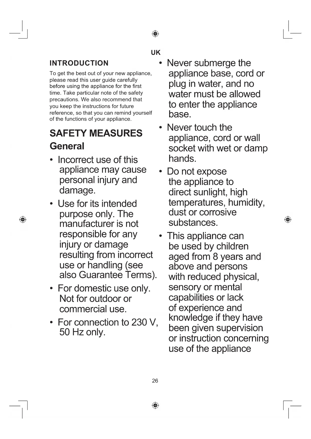 INTRODUCTION To get the best out of your new appliance, please read this user guide carefully before using the appliance for the first time. Take particular note of the safety precautions. We also recommend that you keep the instructions for future reference, so that you can remind yourself of the functions of your appliance. SAFETY MEASURES General