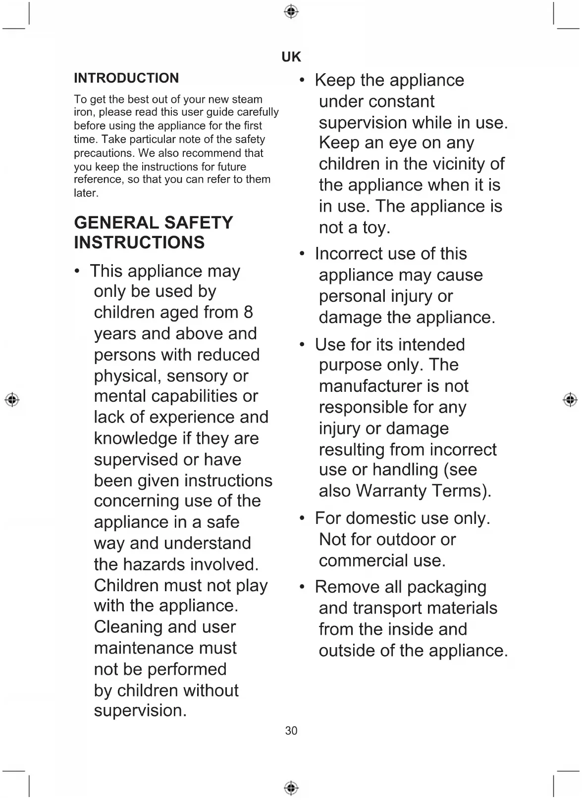 INTRODUCTION To get the best out of your new steam iron, please read this user guide carefully before using the appliance for the first time. Take particular note of the safety precautions. We also recommend that you keep the instructions for future reference, so that you can refer to them later. GENERAL SAFETY INSTRUCTIONS