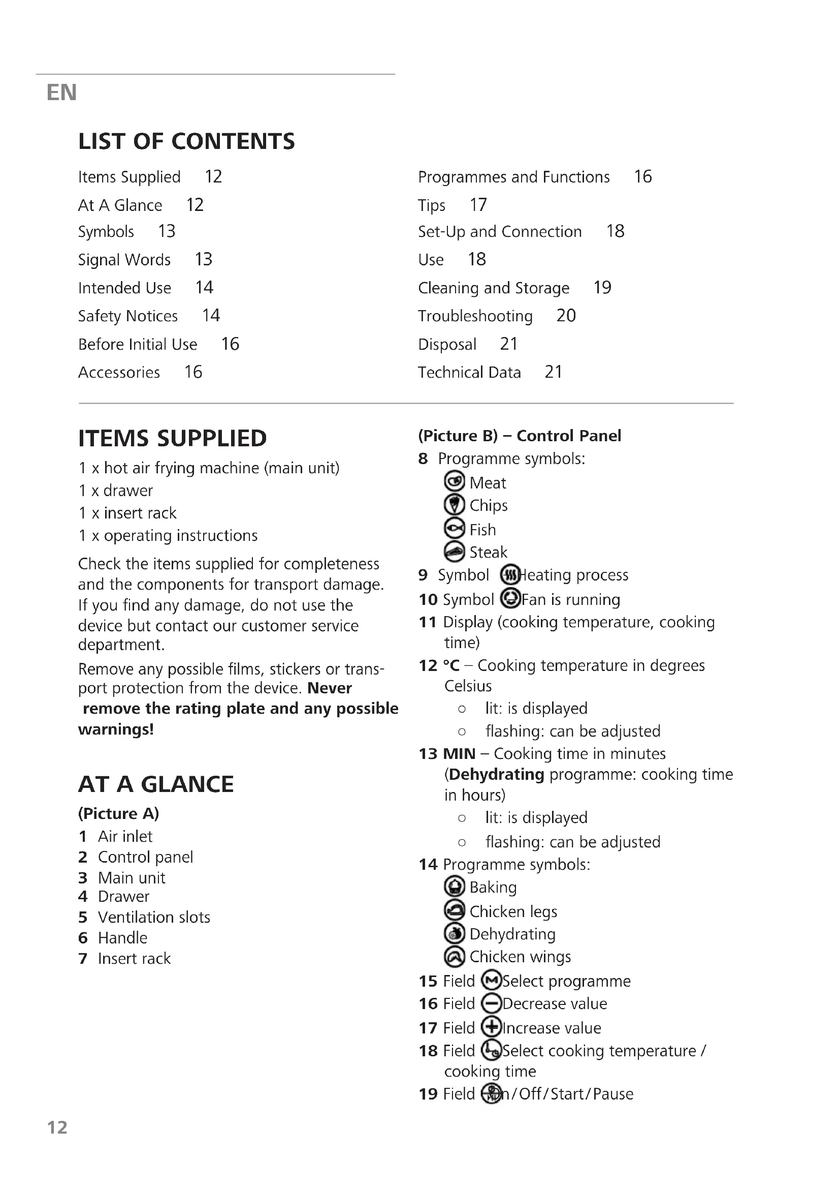 Items Supplied 12 At A Glance 12 Symbols 13 Signal Words 13 Intended Use 14 Safety Notices 14 Before Initial Use 16 Accessories 16 Programmes and Functions 16 Tips 17 Set-Up and Connection 18 Use 18 Cleaning and Storage 19 Troubleshooting 20 Disposal 21 Technical Data 21 ITEMS SUPPLIED 1 x hot air frying machine (main unit) 1 x drawer 1 x insert rack 1 x operating instructions Check the items supplied for completeness and the components for transport damage. If you find any damage, do not use the device but contact our customer service department. Remove any possible films, stickers or trans- port protection from the device. Never remove the rating plate and any possible warnings!