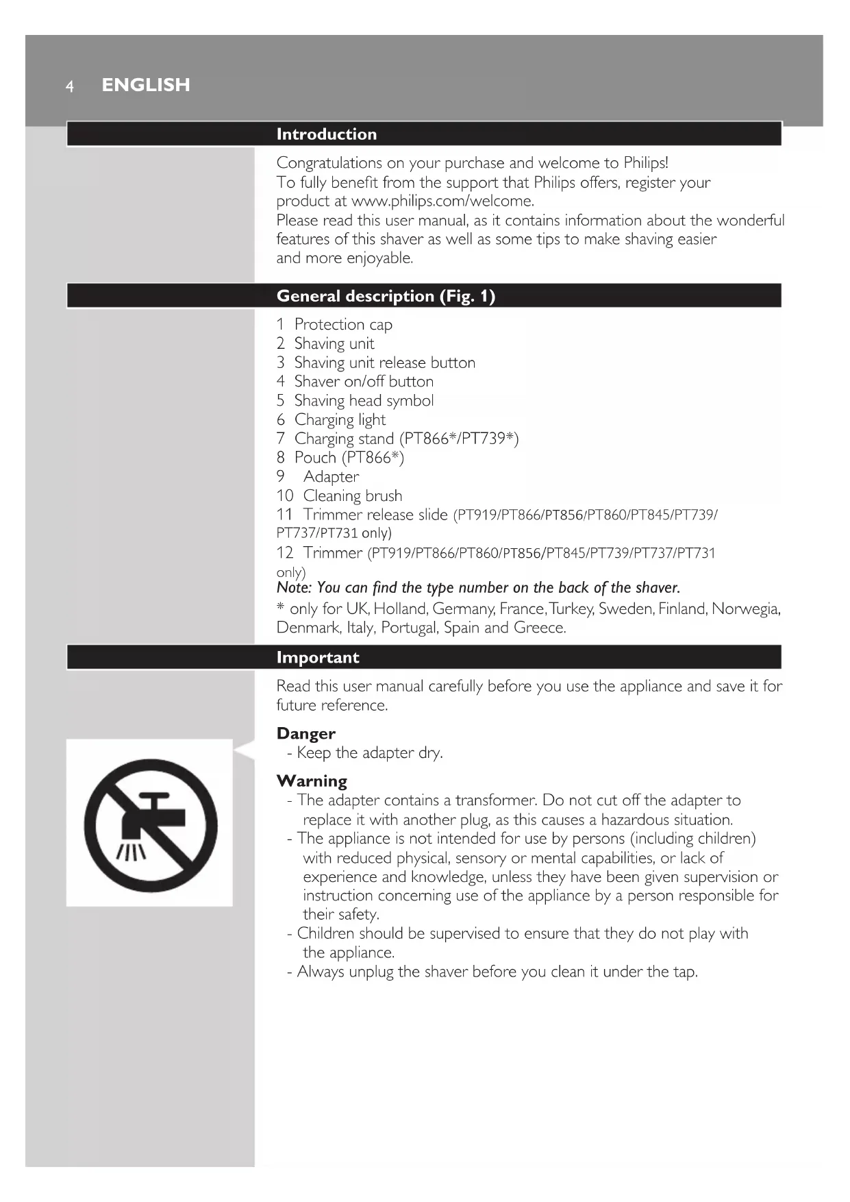 User manual PT919 PT866 PT860 PT856 PT845 PT739 PT737 PT731 PT730 PT727 PT726 PT725 PT723 PT721 PT7201PT919, PT866, PT860, PT856, PT845, PT739, PT737, PT731, PT730, PT727, PT726, PT725, PT723, PT721, PT720 English 4 Dansk 15 DEuTsch 26 Ελληνικα 37 EsPañol 49 suomi 61 Français 72 iTaliano 84 nEDErlanDs 96 norsk 108 PorTuguês 119 svEnska 131 TürkçE 1424 Introduction Congratulations on your purchase and welcome to Philips! To fully benet from the support that Philips offers, register your product at www.philips.com/welcome. Please read this user manual, as it contains information about the wonderful features of this shaver as well as some tips to make shaving easier and more enjoyable. General description (Fig. 1) 1 Protection cap 2 Shaving unit 3 Shaving unit release button 4 Shaver on/off button 5 Shaving head symbol 6 Charging light 7 Charging stand (PT866*/PT739*) 8 Pouch (PT866*) 9 Adapter 10 Cleaning brush 11 Trimmer release slide (PT919/PT866/PT856/PT860/PT845/PT739/ PT737/PT731 only) 12 Trimmer (PT919/PT866/PT860/PT856/ PT845/PT739/PT737/PT731 only) Note: You can nd the type number on the back of the shaver.