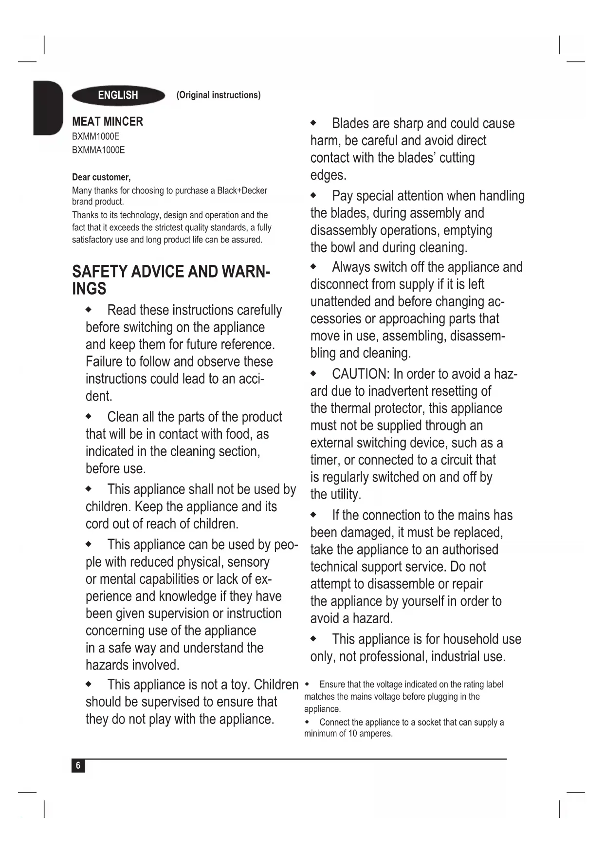 MEAT MINCER BXMM1000E BXMMA1000E Dear customer, Many thanks for choosing to purchase a Black+Decker brand product. Thanks to its technology, design and operation and the fact that it exceeds the strictest quality standards, a fully satisfactory use and long product life can be assured.