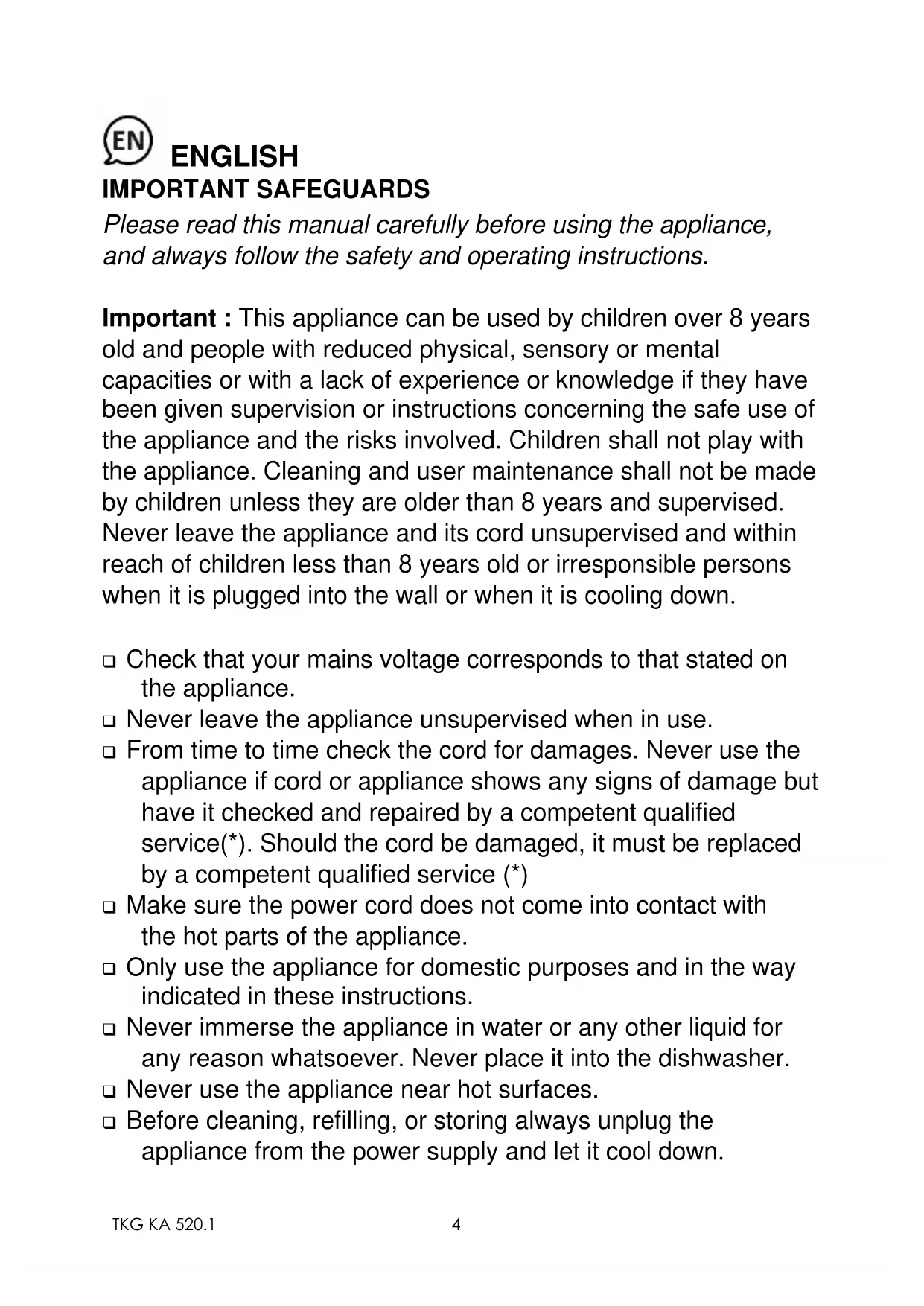 ENGLISH IMPORTANT SAFEGUARDS Please read this manual carefully before using the appliance, and always follow the safety and operating instructions. Important : This appliance can be used by children over 8 years old and people with reduced physical, sensory or mental capacities or with a lack of experience or knowledge if they have been given supervision or instructions concerning the safe use of the appliance and the risks involved. Children shall not play with the appliance. Cleaning and user maintenance shall not be made by children unless they are older than 8 years and supervised. Never leave the appliance and its cord unsupervised and within reach of children less than 8 years old or irresponsible persons when it is plugged into the wall or when it is cooling down. ❑ Check that your mains voltage corresponds to that stated on the appliance. ❑ Never leave the appliance unsupervised when in use. ❑ From time to time check the cord for damages. Never use the appliance if cord or appliance shows any signs of damage but have it checked and repaired by a competent qualified service(*). Should the cord be damaged, it must be replaced by a competent qualified service (*) ❑ Make sure the power cord does not come into contact with the hot parts of the appliance. ❑ Only use the appliance for domestic purposes and in the way indicated in these instructions. ❑ Never immerse the appliance in water or any other liquid for any reason whatsoever. Never place it into the dishwasher. ❑ Never use the appliance near hot surfaces. ❑ Before cleaning, refilling, or storing always unplug the appliance from the power supply and let it cool down.5 TKG KA 520.1