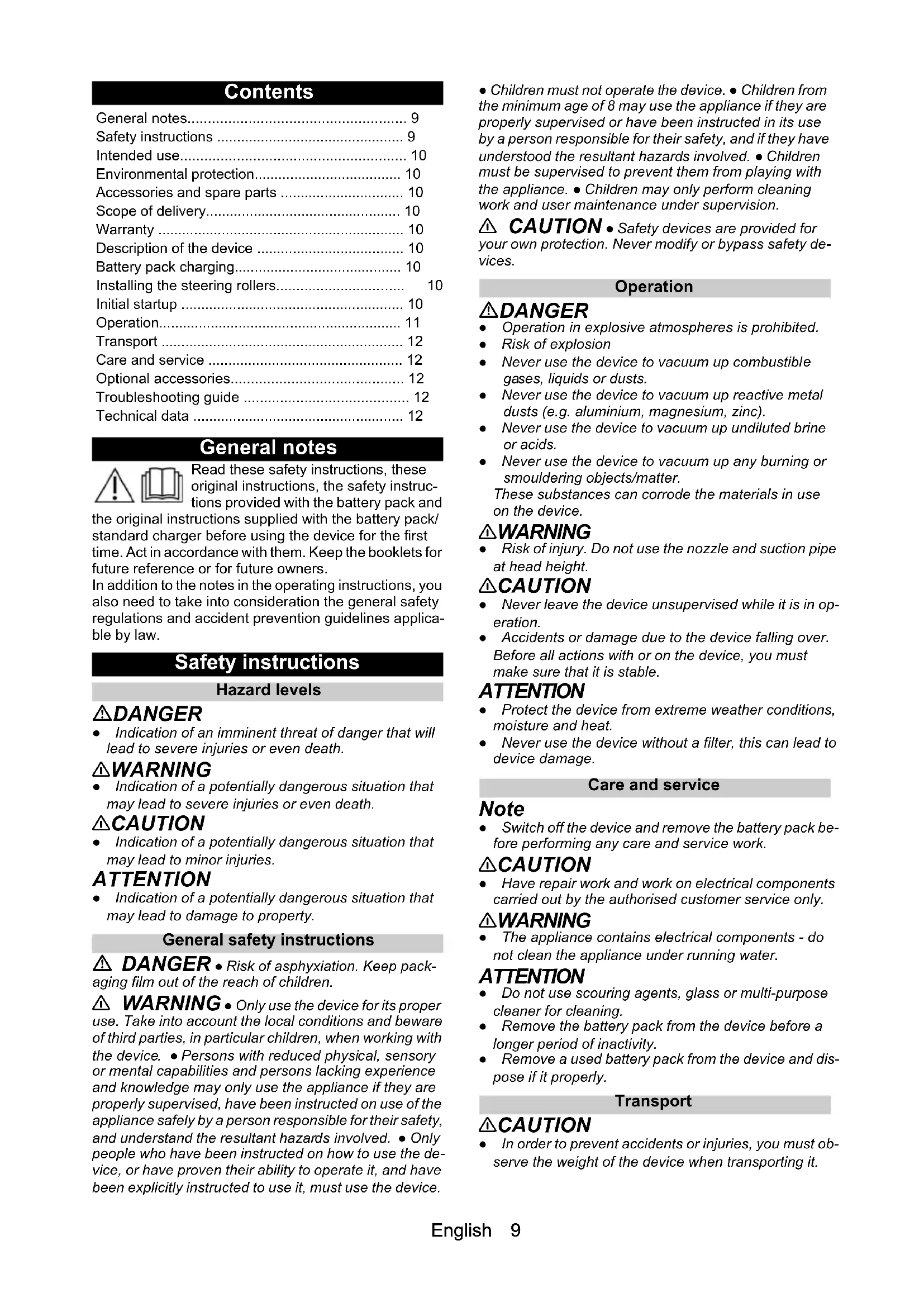 • dusts (e.g. aluminium, magnesium, zinc). ● Never use the device to vacuum up undiluted brine or acids. ● Never use the device to vacuum up any burning or smouldering objects/matter. These substances can corrode the materials in use on the device. 몇 WARNING ● Risk of injury. Do not use the nozzle and suction pipe at head height. 몇 CAUTION ● Never leave the device unsupervised while it is in op- eration. ● Accidents or damage due to the device falling over. Before all actions with or on the device, you must make sure that it is stable. ATTENTION ● Protect the device from extreme weather conditions, moisture and heat. ● Never use the device without a filter, this can lead to device damage. Care and service Note ● Switch off the device and remove the battery pack be- fore performing any care and service work. 몇 CAUTION ● Have repair work and work on electrical components carried out by the authorised customer service only. 몇 WARNING ● The appliance contains electrical components - do not clean the appliance under running water. ATTENTION ● Do not use scouring agents, glass or multi-purpose cleaner for cleaning. ● Remove the battery pack from the device before a longer period of inactivity. ● Remove a used battery pack from the device and dis- pose if it properly. Transport 몇 CAUTION ● In order to prevent accidents or injuries, you must ob- serve the weight of the device when transporting it. General notes p. 9