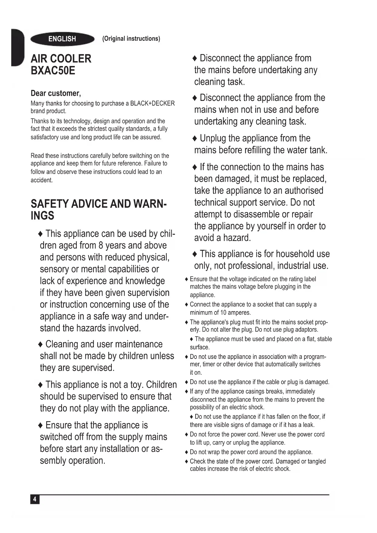 AIR COOLER BXAC50E Dear customer, Many thanks for choosing to purchase a BLACK+DECKER brand product. Thanks to its technology, design and operation and the fact that it exceeds the strictest quality standards, a fully satisfactory use and long product life can be assured. Read these instructions carefully before switching on the appliance and keep them for future reference. Failure to follow and observe these instructions could lead to an accident.