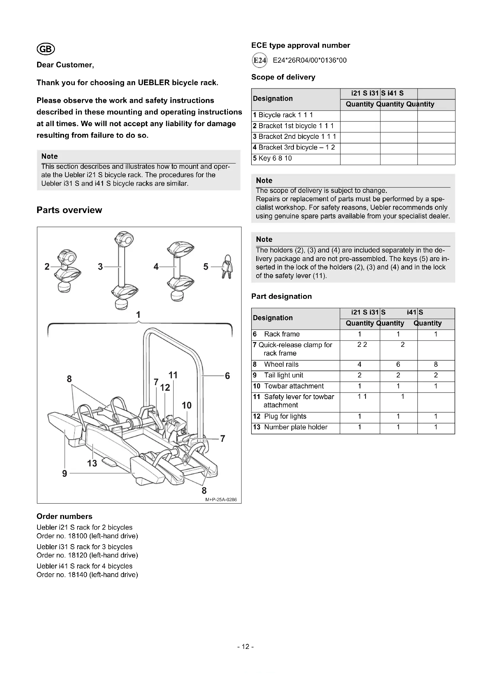 Dear Customer, Thank you for choosing an UEBLER bicycle rack. Please observe the work and safety instructions described in these mounting and operating instructions at all times. We will not accept any liability for damage resulting from failure to do so. Parts overview Order numbers Uebler i21 S rack for 2 bicycles Order no. 18100 (left-hand drive) Uebler i31 S rack for 3 bicycles Order no. 18120 (left-hand drive) Uebler i41 S rack for 4 bicycles Order no. 18140 (left-hand drive) ECE type approval number E24*26R04/00*0136*00 Scope of delivery Part designation Note This section describes and illustrates how to mount and oper- ate the Uebler i21 S bicycle rack. The procedures for the Uebler i31 S and i41 S bicycle racks are similar.
