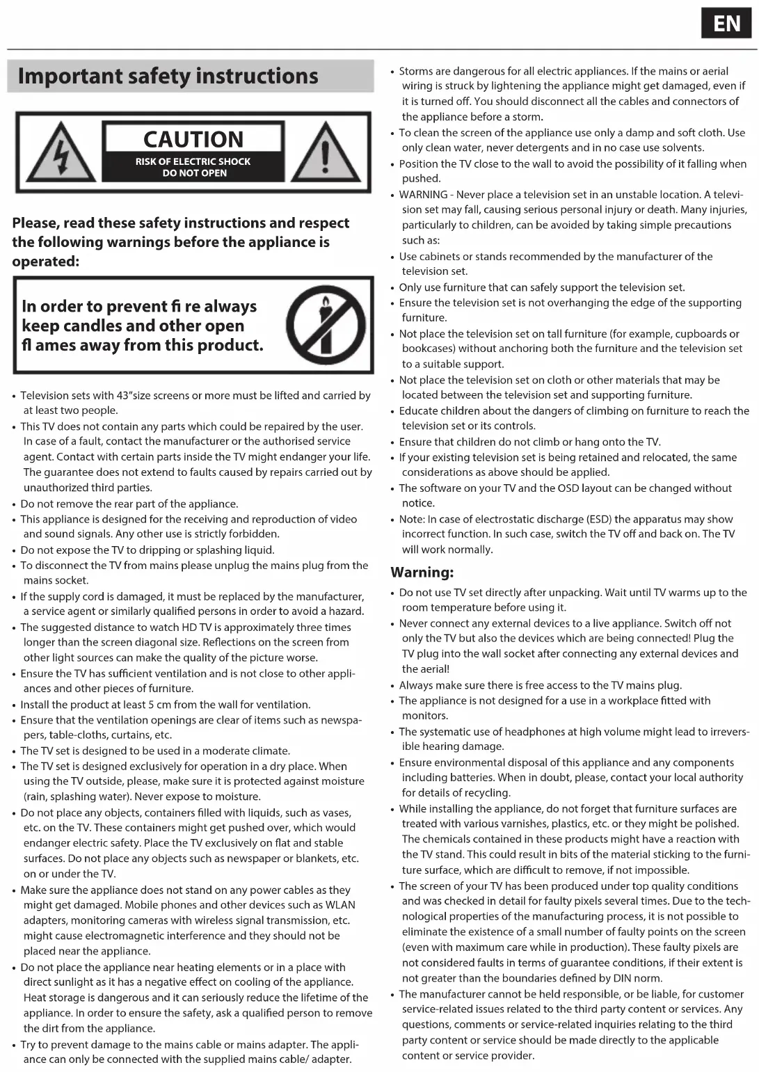 - Television sets with 43”size screens or more must be lifted and carried by at least two people.• This TV does not contain any parts which could be repaired by the user. In case of afault, contact the manufacturer or the authorised service agent. Contact with certain parts inside the TV might endanger your life. The guarantee does not extend to faults caused by repairs carried out by unauthorized third parties.• Do not remove the rear part of the appliance.• This appliance is designed for the receiving and reproduction of video and sound signals. Any other use is strictly forbidden.• Do not expose the TV to dripping or splashing liquid.• To disconnect the TV from mains please unplug the mains plug from the mains socket.• If the supply cord is damaged, it must be replaced by the manufacturer, aservice agent or similarly qualied persons in order to avoid ahazard.• The suggested distance to watch HD TV is approximately three times longer than the screen diagonal size. Reections on the screen from other light sources can make the quality of the picture worse.• Ensure the TV has sucient ventilation and is not close to other appli-ances and other pieces of furniture.• Install the product at least 5 cm from the wall for ventilation.• Ensure that the ventilation openings are clear of items such as newspa-pers, table-cloths, curtains, etc.• The TV set is designed to be used in amoderate climate.• The TV set is designed exclusively for operation in adry place. When using the TV outside, please, make sure it is protected against moisture (rain, splashing water). Never expose to moisture.• Do not place any objects, containers lled with liquids, such as vases, etc. on the TV. These containers might get pushed over, which would endanger electric safety. Place the TV exclusively on at and stable surfaces. Do not place any objects such as newspaper or blankets, etc. on or under the TV.• Make sure the appliance does not stand on any power cables as they might get damaged. Mobile phones and other devices such as WLAN adapters, monitoring cameras with wireless signal transmission, etc. might cause electromagnetic interference and they should not be placed near the appliance.• Do not place the appliance near heating elements or in aplace with direct sunlight as it has anegative eect on cooling of the appliance. Heat storage is dangerous and it can seriously reduce the lifetime of the appliance. In order to ensure the safety, ask aqualied person to remove the dirt from the appliance.• Try to prevent damage to the mains cable or mains adapter. The appli-ance can only be connected with the supplied mains cable/ adapter.• Storms are dangerous for all electric appliances. If the mains or aerial wiring is struck by lightening the appliance might get damaged, even if it is turned o. You should disconnect all the cables and connectors of the appliance before astorm.• To clean the screen of the appliance use only adamp and soft cloth. Use only clean water, never detergents and in no case use solvents.• Position the TV close to the wall to avoid the possibility of it falling when pushed.• WARNING - Never place a television set in an unstable location. A televi-sion set may fall, causing serious personal injury or death. Many injuries, particularly to children, can be avoided by taking simple precautions such as:• Use cabinets or stands recommended by the manufacturer of the television set.• Only use furniture that can safely support the television set.• Ensure the television set is not overhanging the edge of the supporting furniture.• Not place the television set on tall furniture (for example, cupboards or bookcases) without anchoring both the furniture and the television set to a suitable support.• Not place the television set on cloth or other materials that may be located between the television set and supporting furniture.• Educate children about the dangers of climbing on furniture to reach the television set or its controls.• Ensure that children do not climb or hang onto the TV.• If your existing television set is being retained and relocated, the same considerations as above should be applied.• The software on your TV and the OSD layout can be changed without notice.• Note: In case of electrostatic discharge (ESD) the apparatus may show incorrect function. In such case, switch the TV o and back on. The TV will work normally.