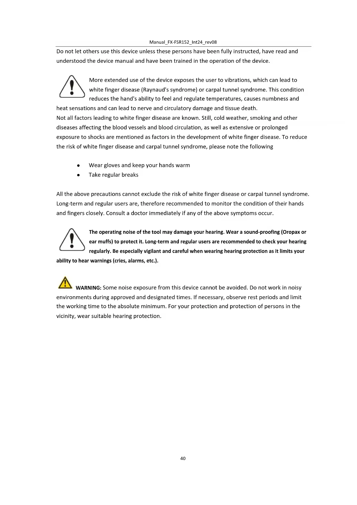 Do not let others use this device unless these persons have been fully instructed, have read and understood the device manual and have been trained in the operation of the device. More extended use of the device exposes the user to vibrations, which can lead to white finger disease (Raynaud's syndrome) or carpal tunnel syndrome. This condition reduces the hand's ability to feel and regulate temperatures, causes numbness and heat sensations and can lead to nerve and circulatory damage and tissue death. Not all factors leading to white finger disease are known. Still, cold weather, smoking and other diseases affecting the blood vessels and blood circulation, as well as extensive or prolonged exposure to shocks are mentioned as factors in the development of white finger disease. To reduce the risk of white finger disease and carpal tunnel syndrome, please note the following ● Wear gloves and keep your hands warm ● Take regular breaks All the above precautions cannot exclude the risk of white finger disease or carpal tunnel syndrome. Long-term and regular users are, therefore recommended to monitor the condition of their hands and fingers closely. Consult a doctor immediately if any of the above symptoms occur. The operating noise of the tool may damage your hearing. Wear a sound-proofing (Oropax or ear muffs) to protect it. Long-term and regular users are recommended to check your hearing regularly. Be especially vigilant and careful when wearing hearing protection as it limits your ability to hear warnings (cries, alarms, etc.).