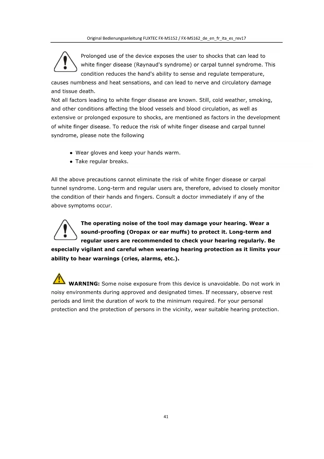 noisy environments during approved and designated times. If necessary, observe rest periods and limit the duration of work to the minimum required. For your personal protection and the protection of persons in the vicinity, wear suitable hearing protection.Original Bedienungsanleitung FUXTEC FX-MS152 / FX-MS162_de_en_fr_ita_es_rev17