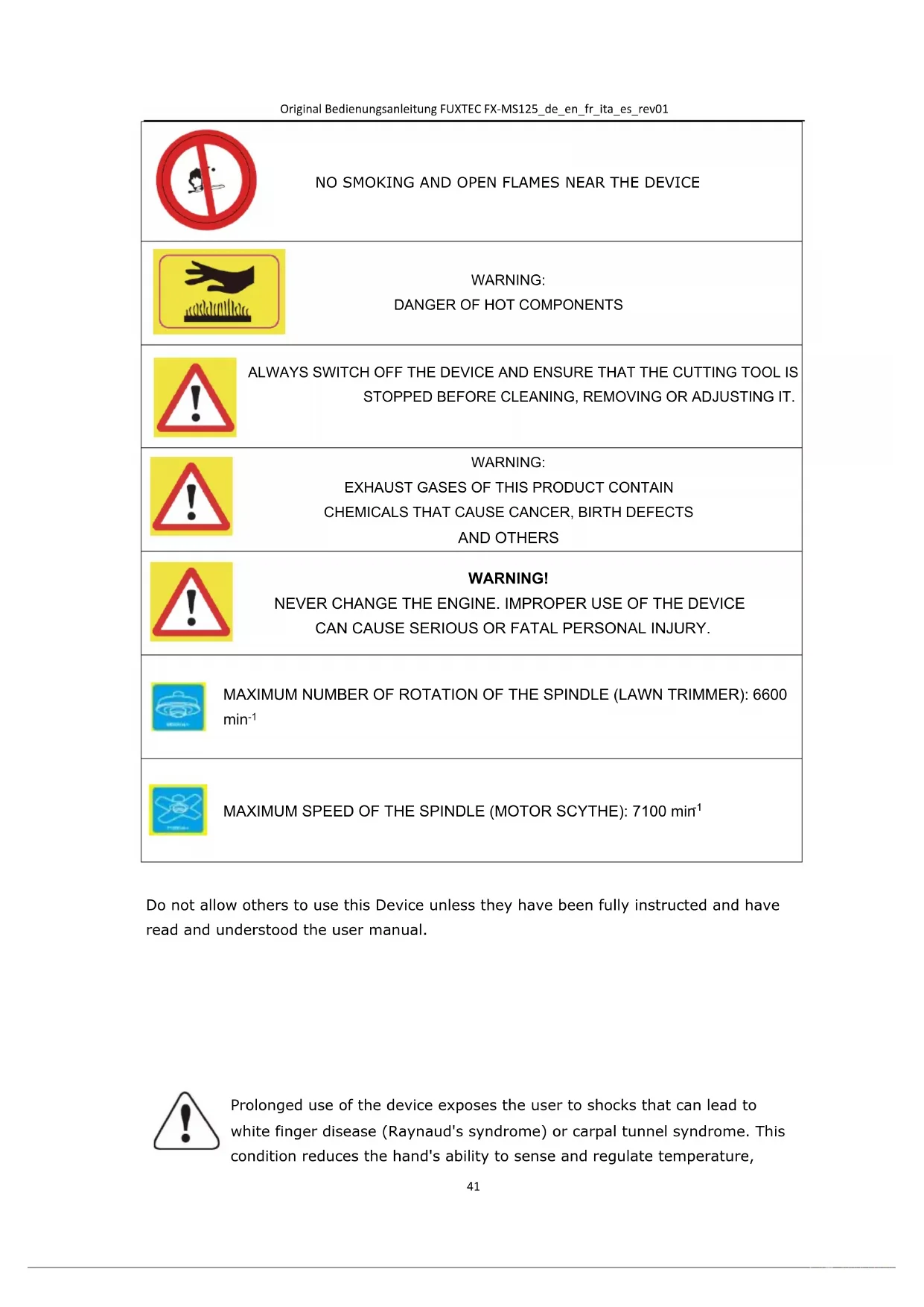 Prolonged use of the device exposes the user to shocks that can lead to white finger disease (Raynaud's syndrome) or carpal tunnel syndrome. This condition reduces the hand's ability to sense and regulate temperature,Original Bedienungsanleitung FUXTEC FX-MS125_de_en_fr_ita_es_rev01