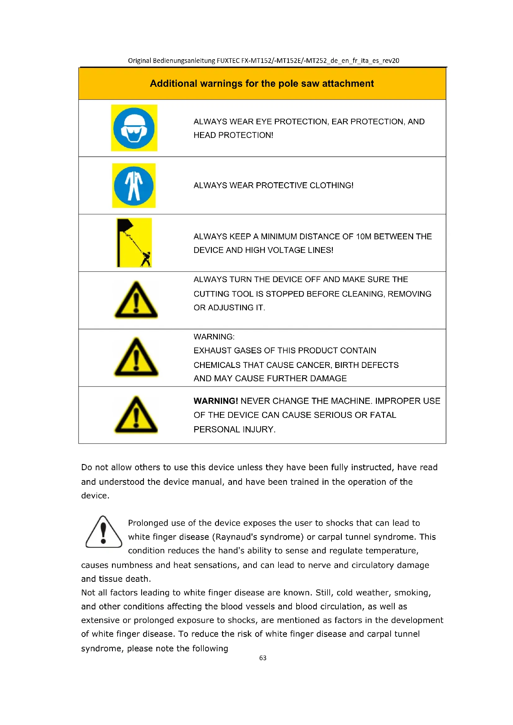 Do not allow others to use this device unless they have been fully instructed, have read and understood the device manual, and have been trained in the operation of the device. Prolonged use of the device exposes the user to shocks that can lead to white finger disease (Raynaud's syndrome) or carpal tunnel syndrome. This condition reduces the hand's ability to sense and regulate temperature, causes numbness and heat sensations, and can lead to nerve and circulatory damage and tissue death. Not all factors leading to white finger disease are known. Still, cold weather, smoking, and other conditions affecting the blood vessels and blood circulation, as well as extensive or prolonged exposure to shocks, are mentioned as factors in the development of white finger disease. To reduce the risk of white finger disease and carpal tunnel syndrome, please note the followingOriginal Bedienungsanleitung FUXTEC FX-MT152/-MT152E/-MT252_de_en_fr_ita_es_rev20