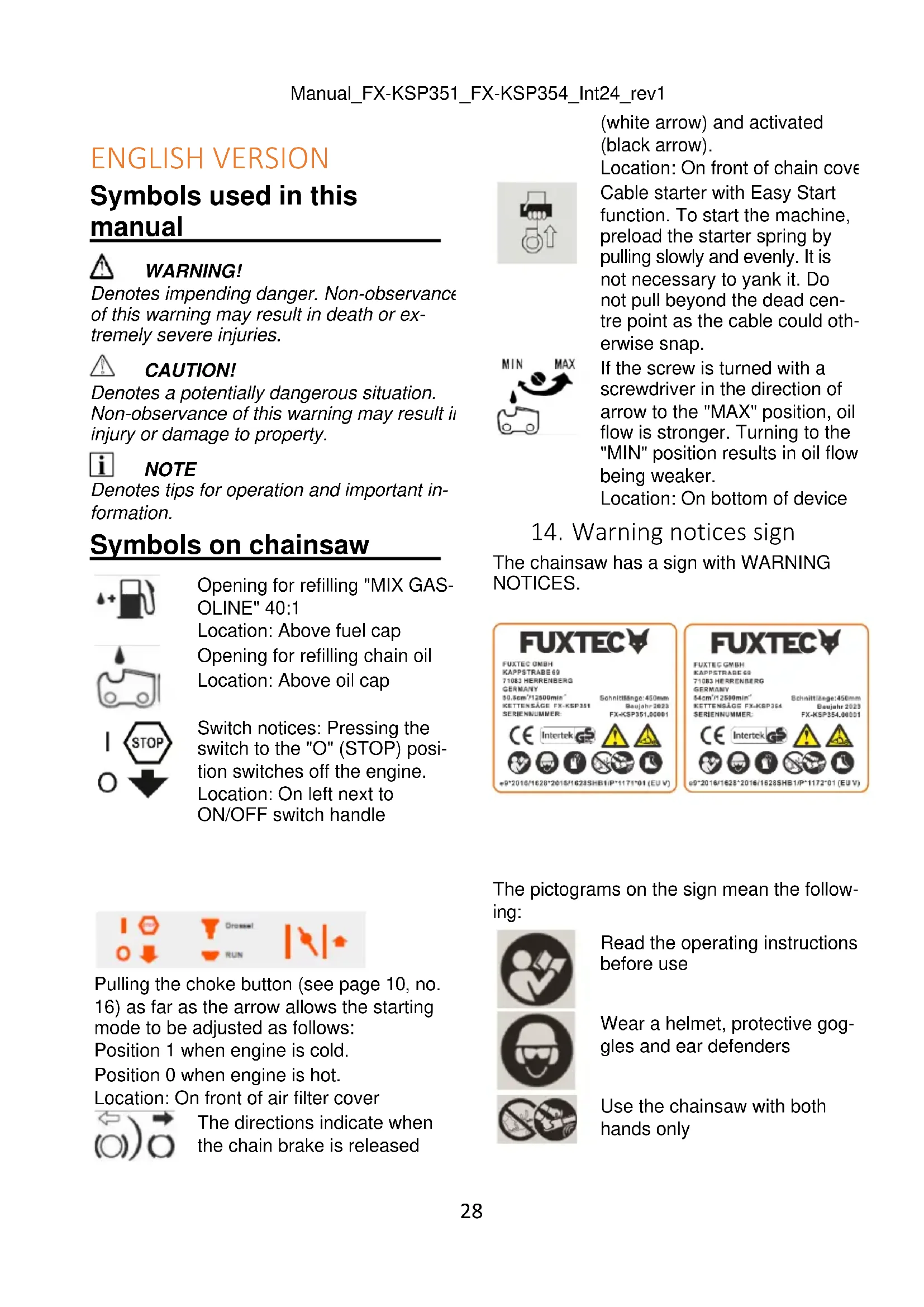 WARNING! Mindless handling of the chainsaw can cause very serious or even fatal injury. Avoid any work, therefore, for which you are not properly prepared or qualified.Manual_FX-KSP351_FX-KSP354_Int24_rev1