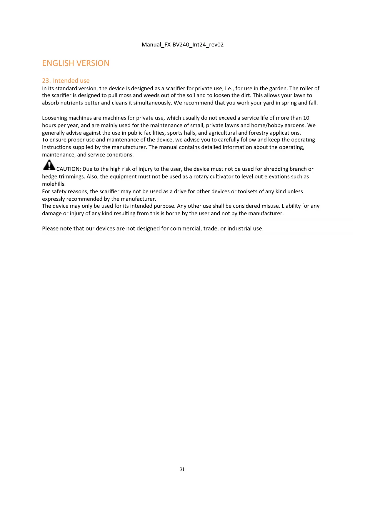 In its standard version, the device is designed as a scarifier for private use, i.e., for use in the garden. The roller of the scarifier is designed to pull moss and weeds out of the soil and to loosen the dirt. This allows your lawn to absorb nutrients better and cleans it simultaneously. We recommend that you work your yard in spring and fall. Loosening machines are machines for private use, which usually do not exceed a service life of more than 10 hours per year, and are mainly used for the maintenance of small, private lawns and home/hobby gardens. We generally advise against the use in public facilities, sports halls, and agricultural and forestry applications. To ensure proper use and maintenance of the device, we advise you to carefully follow and keep the operating instructions supplied by the manufacturer. The manual contains detailed information about the operating, maintenance, and service conditions. CAUTION: Due to the high risk of injury to the user, the device must not be used for shredding branch or hedge trimmings. Also, the equipment must not be used as a rotary cultivator to level out elevations such as molehills. For safety reasons, the scarifier may not be used as a drive for other devices or toolsets of any kind unless expressly recommended by the manufacturer. The device may only be used for its intended purpose. Any other use shall be considered misuse. Liability for any damage or injury of any kind resulting from this is borne by the user and not by the manufacturer. Please note that our devices are not designed for commercial, trade, or industrial use.32 Manual_FX-BV240_Int24_rev02