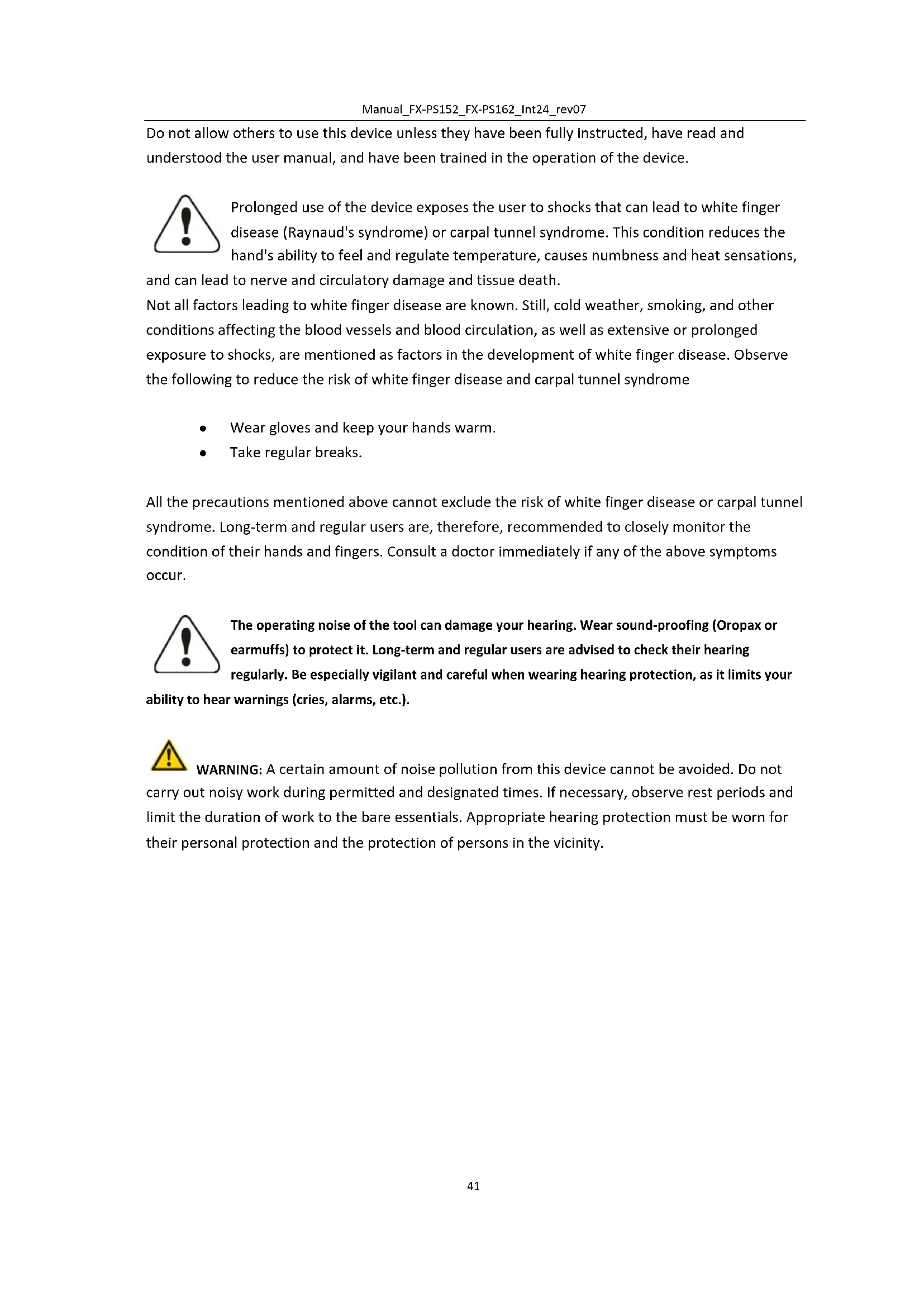 Do not allow others to use this device unless they have been fully instructed, have read and understood the user manual, and have been trained in the operation of the device. Prolonged use of the device exposes the user to shocks that can lead to white finger disease (Raynaud's syndrome) or carpal tunnel syndrome. This condition reduces the hand's ability to feel and regulate temperature, causes numbness and heat sensations, and can lead to nerve and circulatory damage and tissue death. Not all factors leading to white finger disease are known. Still, cold weather, smoking, and other conditions affecting the blood vessels and blood circulation, as well as extensive or prolonged exposure to shocks, are mentioned as factors in the development of white finger disease. Observe the following to reduce the risk of white finger disease and carpal tunnel syndrome ● Wear gloves and keep your hands warm. ● Take regular breaks. All the precautions mentioned above cannot exclude the risk of white finger disease or carpal tunnel syndrome. Long-term and regular users are, therefore, recommended to closely monitor the condition of their hands and fingers. Consult a doctor immediately if any of the above symptoms occur. The operating noise of the tool can damage your hearing. Wear sound-proofing (Oropax or earmuffs) to protect it. Long-term and regular users are advised to check their hearing regularly. Be especially vigilant and careful when wearing hearing protection, as it limits your ability to hear warnings (cries, alarms, etc.).