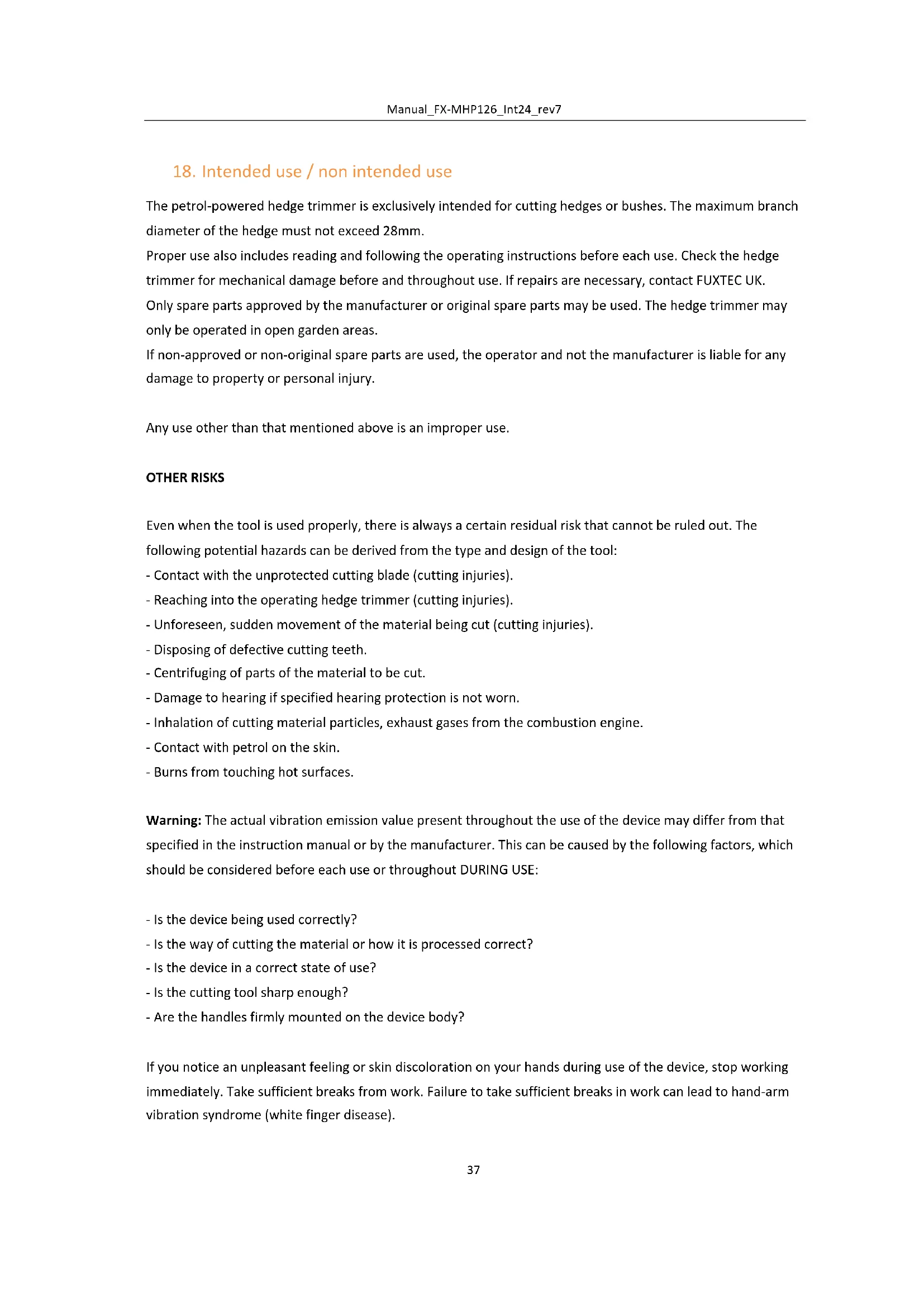 The petrol-powered hedge trimmer is exclusively intended for cutting hedges or bushes. The maximum branch diameter of the hedge must not exceed 28mm. Proper use also includes reading and following the operating instructions before each use. Check the hedge trimmer for mechanical damage before and throughout use. If repairs are necessary, contact FUXTEC UK. Only spare parts approved by the manufacturer or original spare parts may be used. The hedge trimmer may only be operated in open garden areas. If non-approved or non-original spare parts are used, the operator and not the manufacturer is liable for any damage to property or personal injury. Any use other than that mentioned above is an improper use. OTHER RISKS Even when the tool is used properly, there is always a certain residual risk that cannot be ruled out. The following potential hazards can be derived from the type and design of the tool: - Contact with the unprotected cutting blade (cutting injuries). - Reaching into the operating hedge trimmer (cutting injuries). - Unforeseen, sudden movement of the material being cut (cutting injuries). - Disposing of defective cutting teeth. - Centrifuging of parts of the material to be cut. - Damage to hearing if specified hearing protection is not worn. - Inhalation of cutting material particles, exhaust gases from the combustion engine. - Contact with petrol on the skin. - Burns from touching hot surfaces.