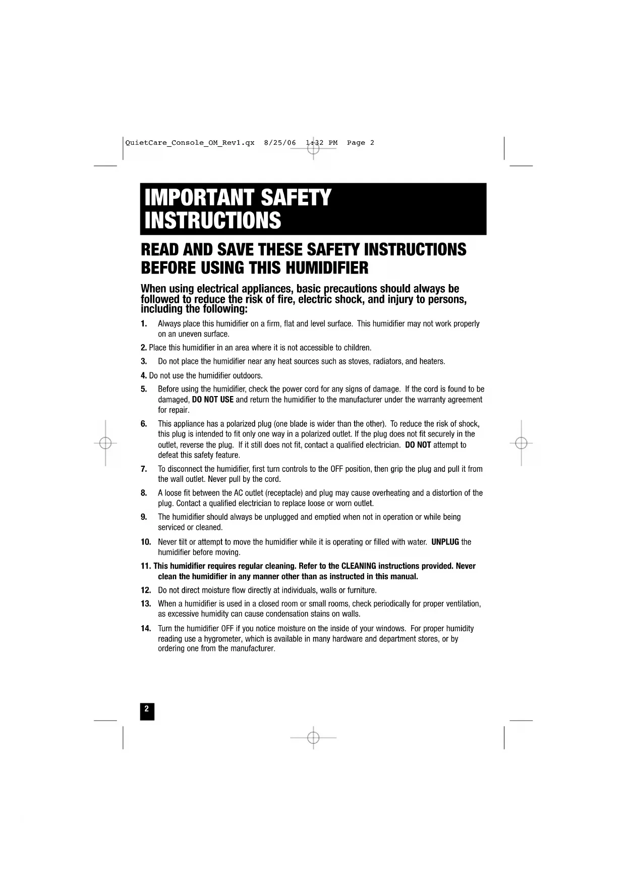 CONSOLE HUMIDIFIERS MODELS: HCM-6011i HCM-6012i HCM-6013i HCM-6011WW QuietCare_Console_OM_Rev1.qx 8/25/06 1:32 PM Page 12 When using electrical appliances, basic precautions should always be followed to reduce the risk of fire, electric shock, and injury to persons, including the following: