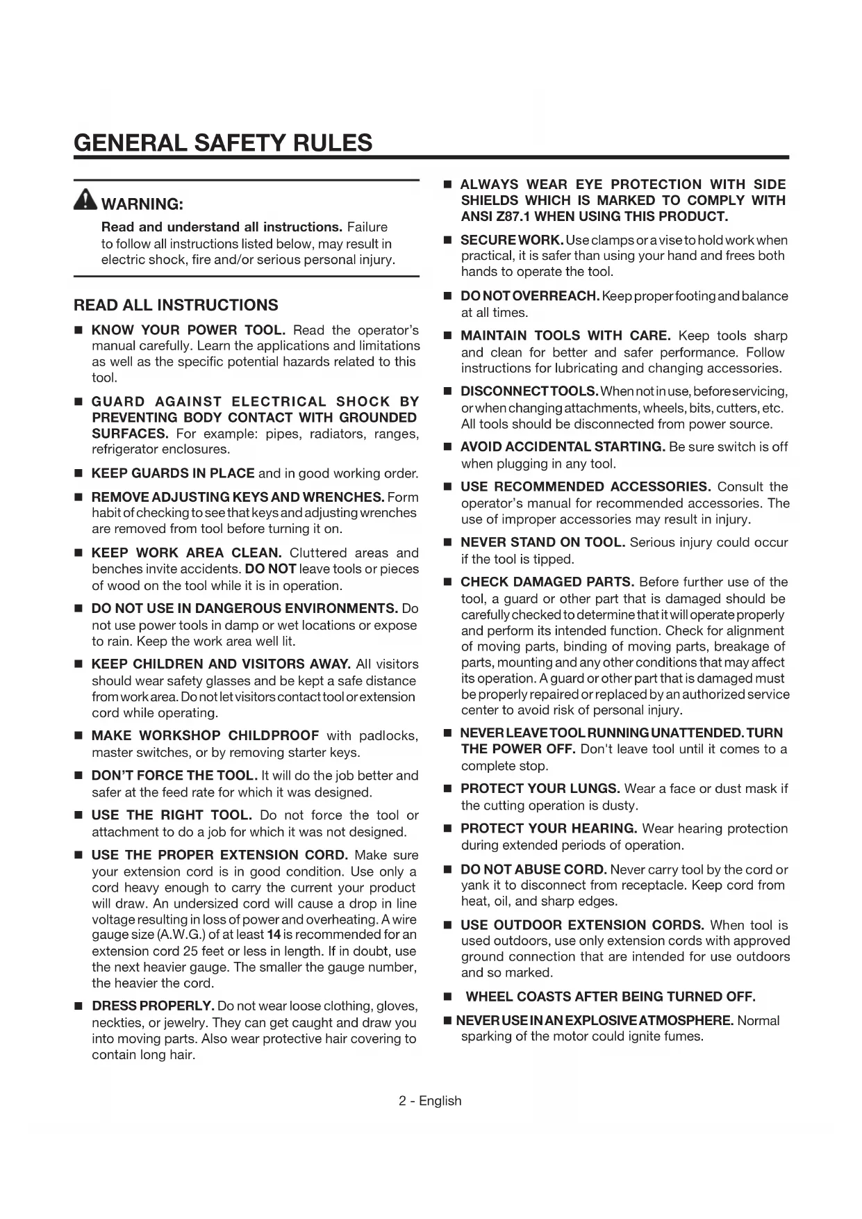 SHIELDS WHICH IS MARKED TO COMPLY WITH ANSI Z87.1 WHEN USING THIS PRODUCT. SECURE WORK. Use clamps or a vise to hold work when practical, it is safer than using your hand and frees both hands to operate the tool. DO NOT OVERREACH. Keep proper footing and balance at all times. MAINTAIN TOOLS WITH CARE. Keep tools sharp and clean for better and safer performance. Follow instructions for lubricating and changing accessories. DISCONNECT TOOLS. When not in use, before servicing, or when changing attachments, wheels, bits, cutters, etc. All tools should be disconnected from power source. AVOID ACCIDENTAL STARTING. Be sure switch is off when plugging in any tool. USE RECOMMENDED ACCESSORIES. Consult the operator’s manual for recommended accessories. The use of improper accessories may result in injury. NEVER STAND ON TOOL. Serious injury could occur if the tool is tipped. CHECK DAMAGED PARTS. Before further use of the tool, a guard or other part that is damaged should be carefully checked to determine that it will operate properly and perform its intended function. Check for alignment of moving parts, binding of moving parts, breakage of parts, mounting and any other conditions that may affect its operation. A guard or other part that is damaged must be properly repaired or replaced by an authorized service center to avoid risk of personal injury.