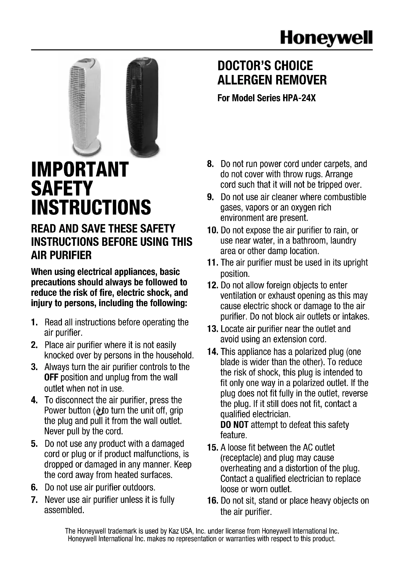 ALLERGEN REMOVER For Model Series HPA-24X IMPORTANT SAFETY INSTRUCTIONS