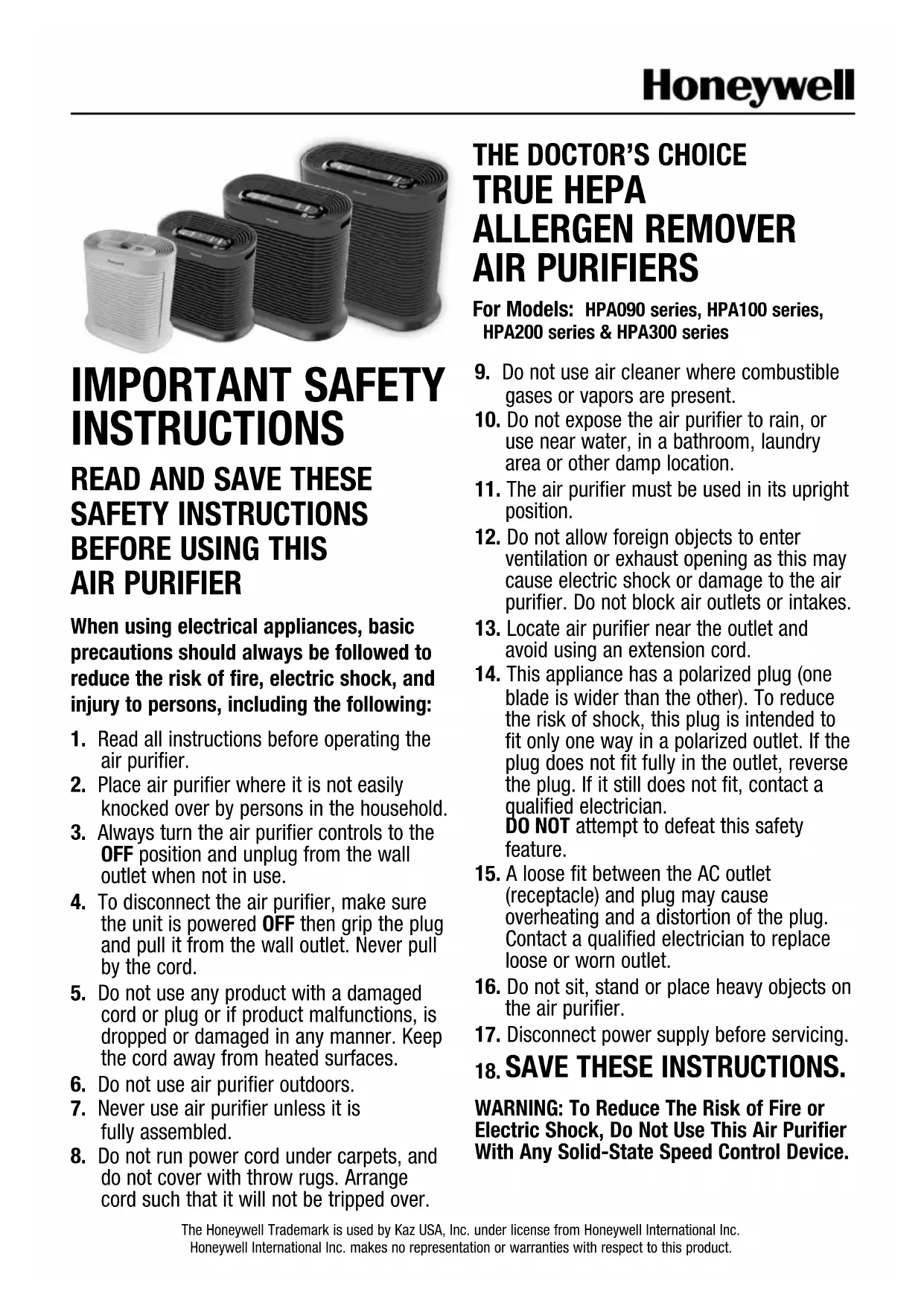 TRUE HEPA ALLERGEN REMOVER AIR PURIFIERS For Models: HPA090 series, HPA100 series, HPA200 series & HPA300 series The Honeywell Trademark is used by Kaz USA, Inc. under license from Honeywell International Inc. Honeywell International Inc. makes no representation or warranties with respect to this product.2 3 HPA100 series, HPA200 series, HPA300 series Type