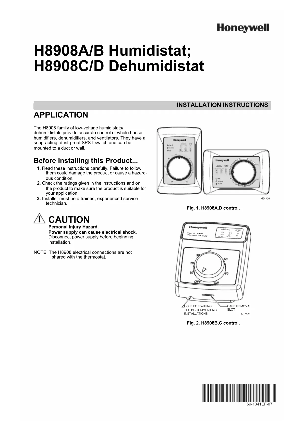 INSTALLATION INSTRUCTIONS Place Bar Code Here 69-1341EF-07 H8908A/B Humidistat; H8908C/D Dehumidistat APPLICATION The H8908 family of low-voltage humidistats/dehumidistats provide accurate control of whole house humidifiers, dehumidifiers, and ventilators. They have a snap-acting, dust-proof SPST switch and can be mounted to a duct or wall. Before Installing this Product... 1. Read these instructions carefully. Failure to follow them could damage the product or cause a hazard-ous condition.2. Check the ratings given in the instructions and on the product to make sure the product is suitable for your application.3. Installer must be a trained, experienced service technician. CAUTION Personal Injury Hazard.Power supply can cause electrical shock.Disconnect power supply before beginning installation.NOTE: The H8908 electrical connections are not shared with the thermostat.Fig. 1. H8908A,D control.Fig. 2. H8908B,C control.M24726Humidity ControlRégulateur d'humidité-20 F-10 F 0 F +10 F+20 FOver 20 F 15% 20% 25% 30% 35% 40%