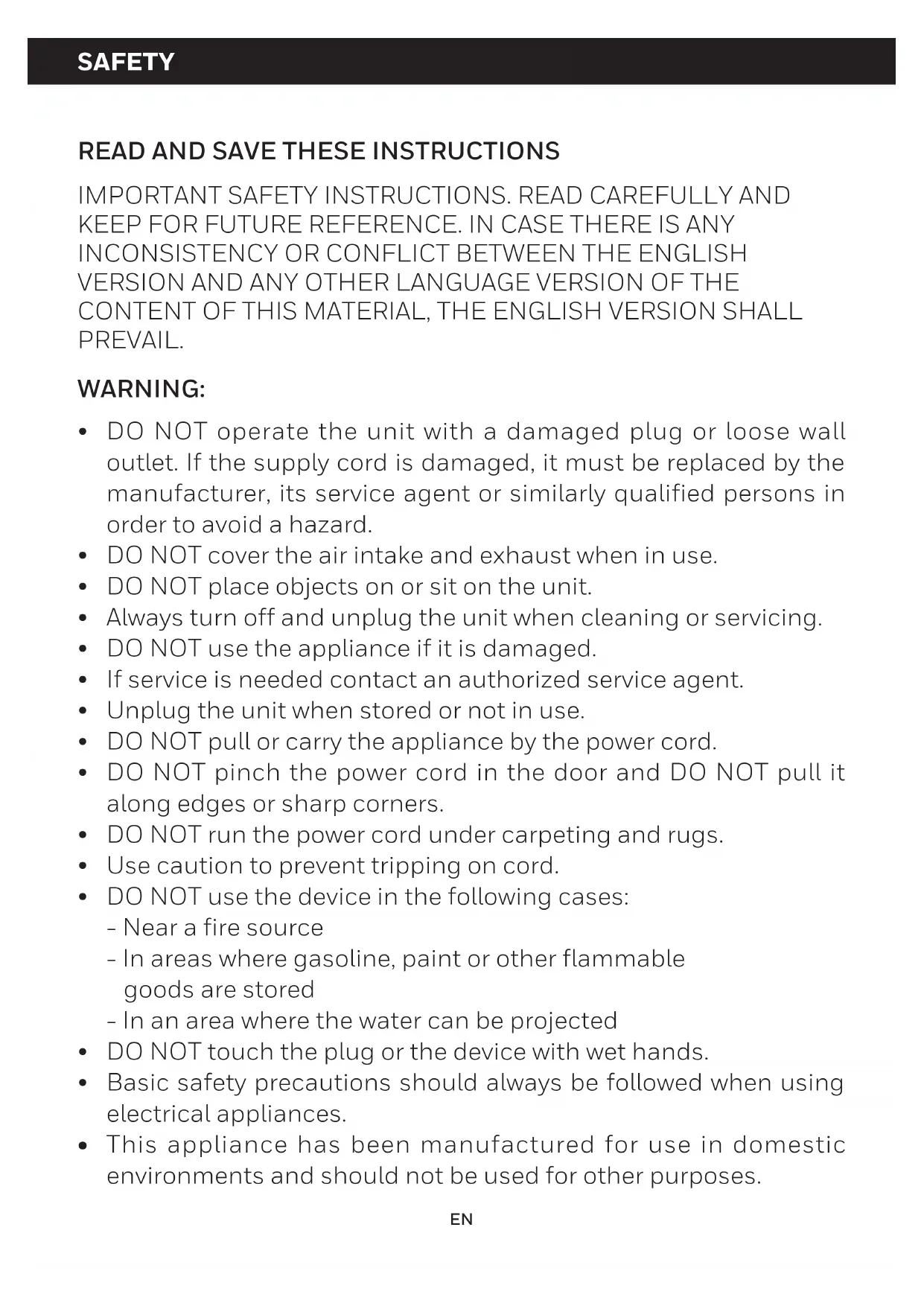 DO NOT operate the unit with a damaged plug or loose wall outlet. If the supply cord is damaged, it must be replaced by the manufacturer, its service agent or similarly qualified persons in order to avoid a hazard. DO NOT cover the air intake and exhaust when in use. DO NOT place objects on or sit on the unit. Always turn off and unplug the unit when cleaning or servicing. DO NOT use the appliance if it is damaged. If service is needed contact an authorized service agent. Unplug the unit when stored or not in use. DO NOT pull or carry the appliance by the power cord. DO NOT pinch the power cord in the door and DO NOT pull it along edges or sharp corners. DO NOT run the power cord under carpeting and rugs. Use caution to prevent tripping on cord. DO NOT use the device in the following cases: - Near a fire source - In areas where gasoline, paint or other flammable goods are stored - In an area where the water can be projected DO NOT touch the plug or the device with wet hands. Basic safety precautions should always be followed when using electrical appliances. This appliance has been manufactured for use in domestic environments and should not be used for other purposes. SAFETY