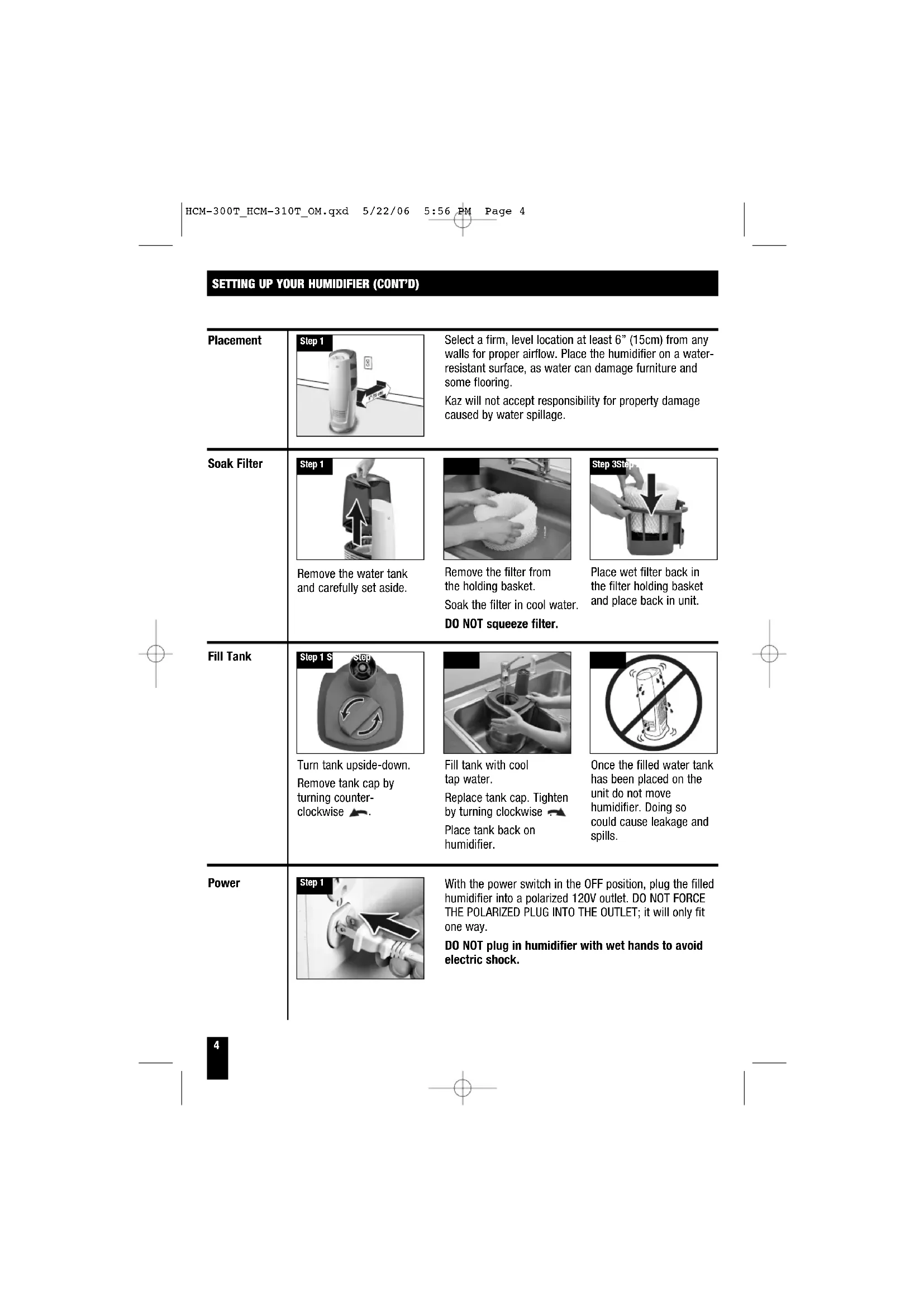 HCM-300T_HCM-310T_OM.qxd 5/22/06 5:56 PM Page 3Step 1 Step 3Step 2 Fill tank with cool tap water. Replace tank cap. Tighten by turning clockwise . Place tank back on humidifier. Remove the filter from the holding basket. Soak the filter in cool water. DO NOT squeeze filter. Place wet filter back in the filter holding basket and place back in unit. SETTING UP YOUR HUMIDIFIER (CONT’D) Placement Soak Filter Power Fill Tank Remove the water tank and carefully set aside. Turn tank upside-down. Remove tank cap by turning counter- clockwise