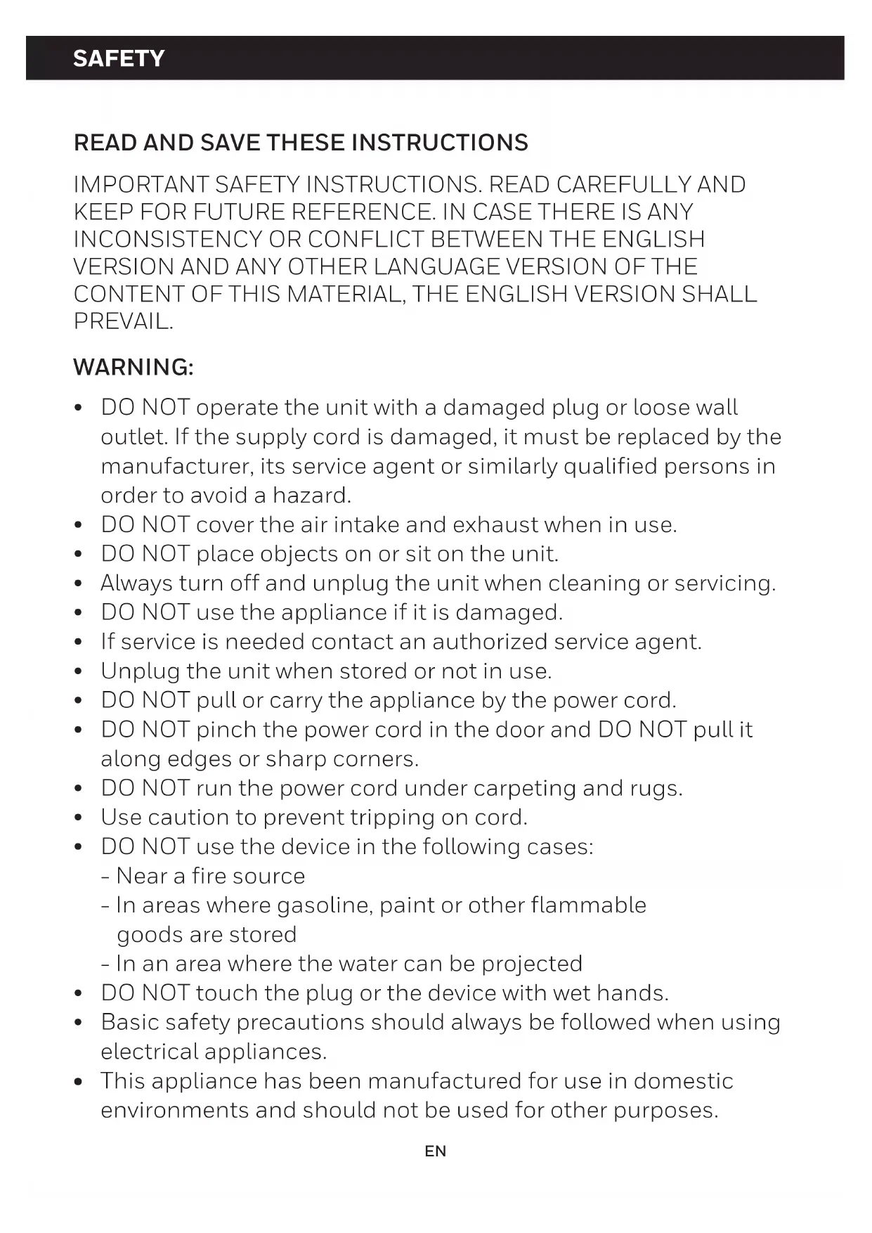DO NOT operate the unit with a damaged plug or loose wall outlet. If the supply cord is damaged, it must be replaced by the manufacturer, its service agent or similarly qualified persons in order to avoid a hazard. DO NOT cover the air intake and exhaust when in use. DO NOT place objects on or sit on the unit. Always turn off and unplug the unit when cleaning or servicing. DO NOT use the appliance if it is damaged. If service is needed contact an authorized service agent. Unplug the unit when stored or not in use. DO NOT pull or carry the appliance by the power cord. DO NOT pinch the power cord in the door and DO NOT pull it along edges or sharp corners. DO NOT run the power cord under carpeting and rugs. Use caution to prevent tripping on cord. DO NOT use the device in the following cases: - Near a fire source - In areas where gasoline, paint or other flammable goods are stored - In an area where the water can be projected DO NOT touch the plug or the device with wet hands. Basic safety precautions should always be followed when using electrical appliances. This appliance has been manufactured for use in domestic environments and should not be used for other purposes. SAFETY