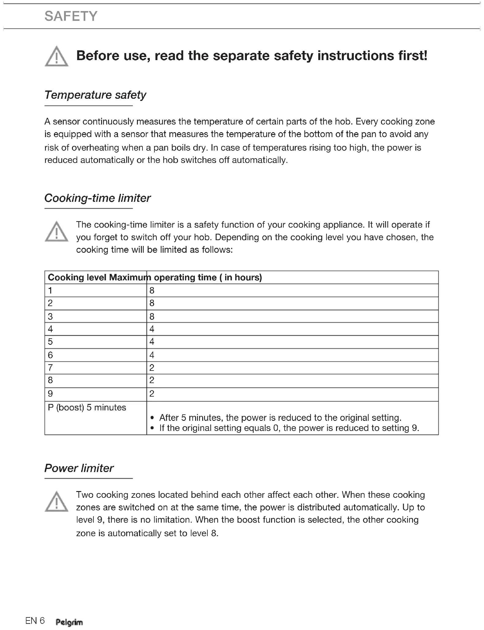 Power level cooking zone Boost Pan detection symbol Pause symbol Residual heat indicators Lock symbol Timer has been setEN 6 Before use, read the separate safety instructions first! Temperature safety A sensor continuously measures the temperature of certain parts of the hob. Every cooking zone is equipped with a sensor that measures the temperature of the bottom of the pan to avoid any risk of overheating when a pan boils dry. In case of temperatures rising too high, the power is reduced automatically or the hob switches off automatically. Cooking-time limiter The cooking-time limiter is a safety function of your cooking appliance. It will operate if you forget to switch off your hob. Depending on the cooking level you have chosen, the cooking time will be limited as follows: Cooking level Maximum operating time ( in hours)