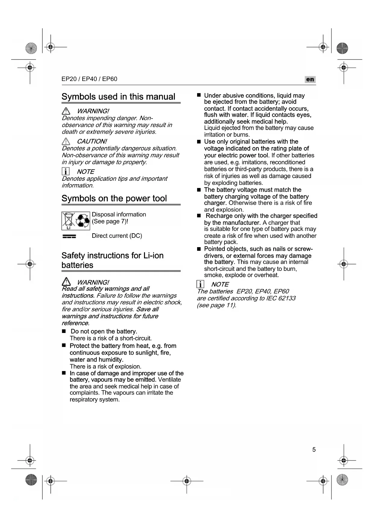 Pointed objects, such as nails or screw- drivers, or external forces may damage the battery. This may cause an internal short-circuit and the battery to burn, smoke, explode or overheat. NOTE The batteries EP20, EP40, EP60 are certified according to IEC 62133 (see page 11). Disposal information (See page 7)! Direct current (DC)EP20 / EP40 / EP60