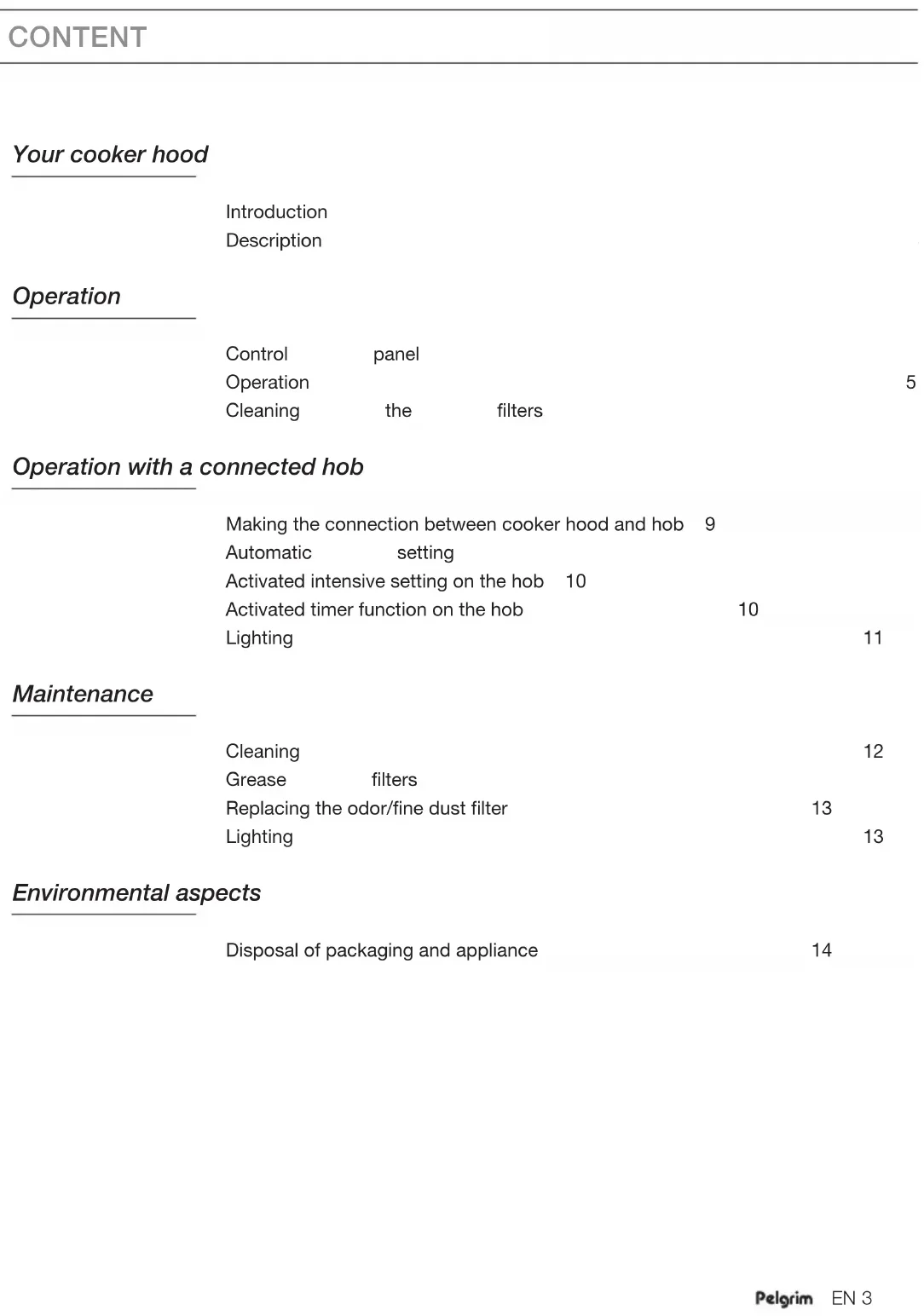 - DO NOT wash or reuse the odor/fine dust filter. Saturated carbon is not environmentally friendly, change the filter regularly. Lighting This hood is fitted with a light system. This light system has to be replaced by an authorized technician. Do not attempt to replace it by yourself. The lamp in this household appliance is only suitable for illumination of this appliance. The lamp is not suitable for household room illumination. MAINTENANCEEN 14 ENVIRONMENTAL ASPECTS Disposal of packaging and appliance This appliance is made from sustainable materials. This appliance must be disposed of in a responsible manner at the end of its service life. Contact the local authorities for information about the method. The packaging of the appliance is recyclable. The following materials may have been used: