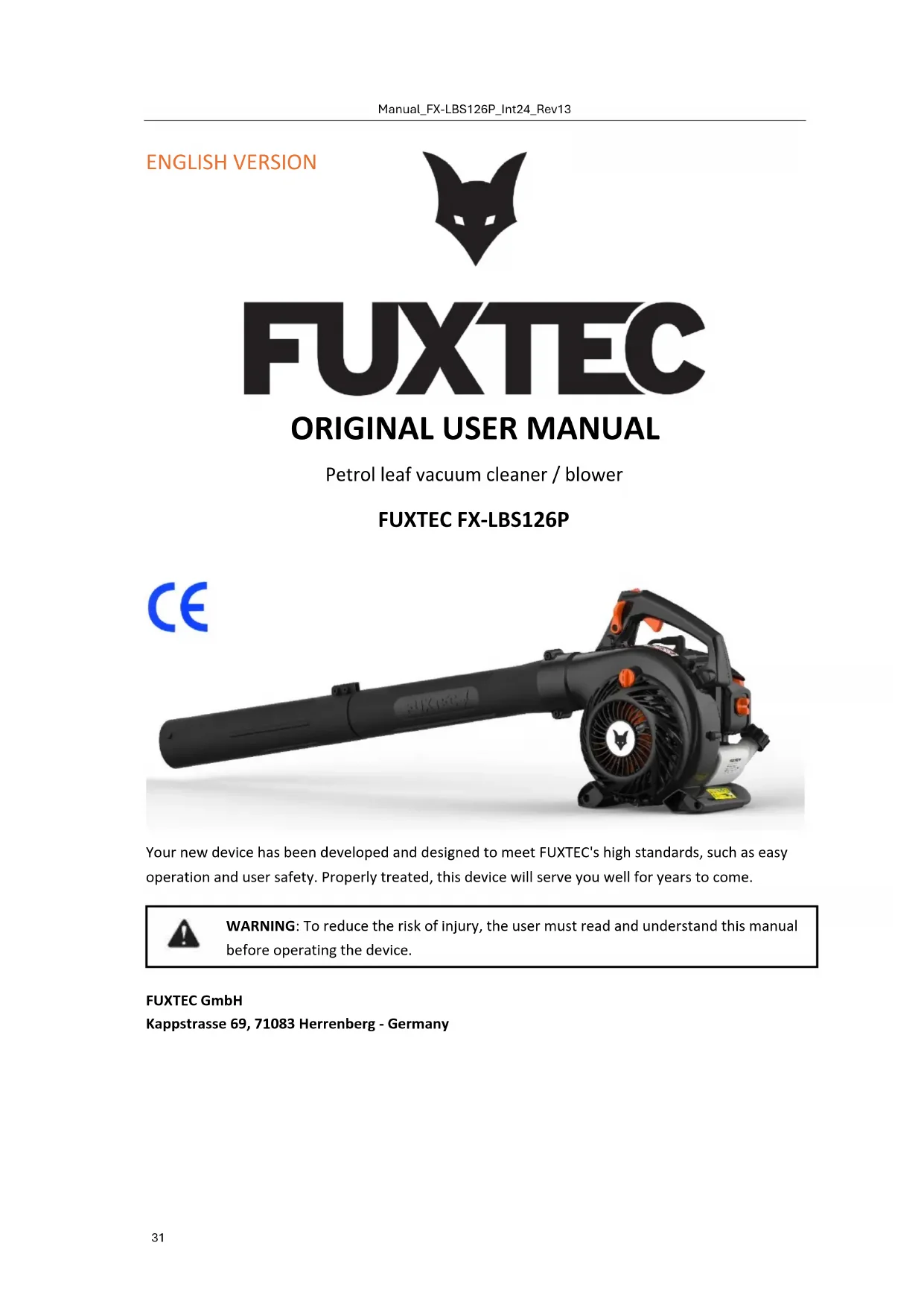 Download the instructions for your Blower in PDF format for free! Find your manual FX-LBS126P - Fuxtec and take your electronic device back in hand. On this page are published all the documents necessary for the use of your device. FX-LBS126P by Fuxtec.