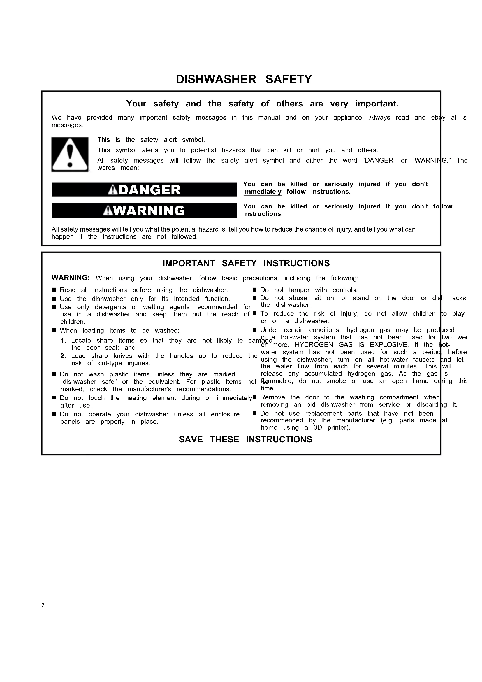 risk of cut-type injuries. Do not wash plastic items unless they are marked "dishwasher safe" or the equivalent. For plastic items not so marked, check the manufacturer's recommendations. Do not touch the heating element during or immediately after use. Do not operate your dishwasher unless all enclosure panels are properly in place. Do not tamper with controls. Do not abuse, sit on, or stand on the door or dish racks of the dishwasher. To reduce the risk of injury, do not allow children to play in or on a dishwasher. Under certain conditions, hydrogen gas may be produced in a hot-water system that has not been used for two weeks or more. HYDROGEN GAS IS EXPLOSIVE. If the hot- water system has not been used for such a period, before using the dishwasher, turn on all hot-water faucets and let the water flow from each for several minutes. This will release any accumulated hydrogen gas. As the gas is flammable, do not smoke or use an open flame during this time. Remove the door to the washing compartment when removing an old dishwasher from service or discarding it. Do not use replacement parts that have not been recommended by the manufacturer (e.g. parts made at home using a 3D printer).