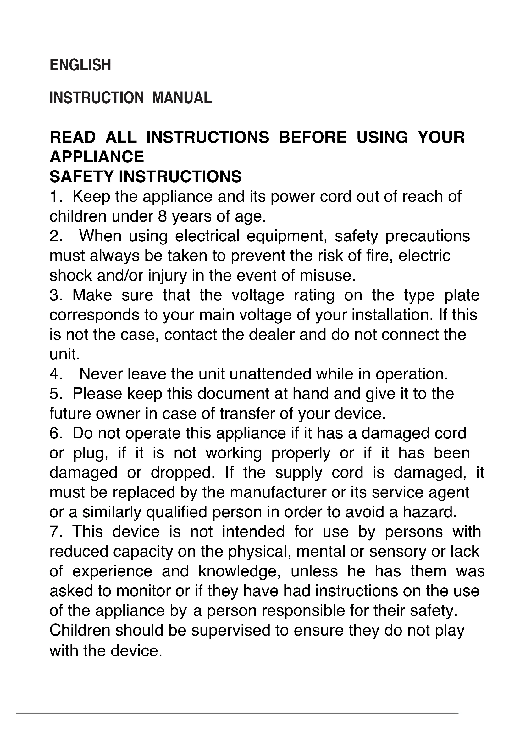 reduced capacity on the physical, mental or sensory or lack of experience and knowledge, unless he has them was asked to monitor or if they have had instructions on the use of the appliance by a person responsible for their safety. Children should be supervised to ensure they do not play with the device.8. This appliance is intended for use in domestic and similar applications such as: - kitchen areas in shops, offices and other working environments - farmhouses - in hotels, motels and other residential environments - guest rooms