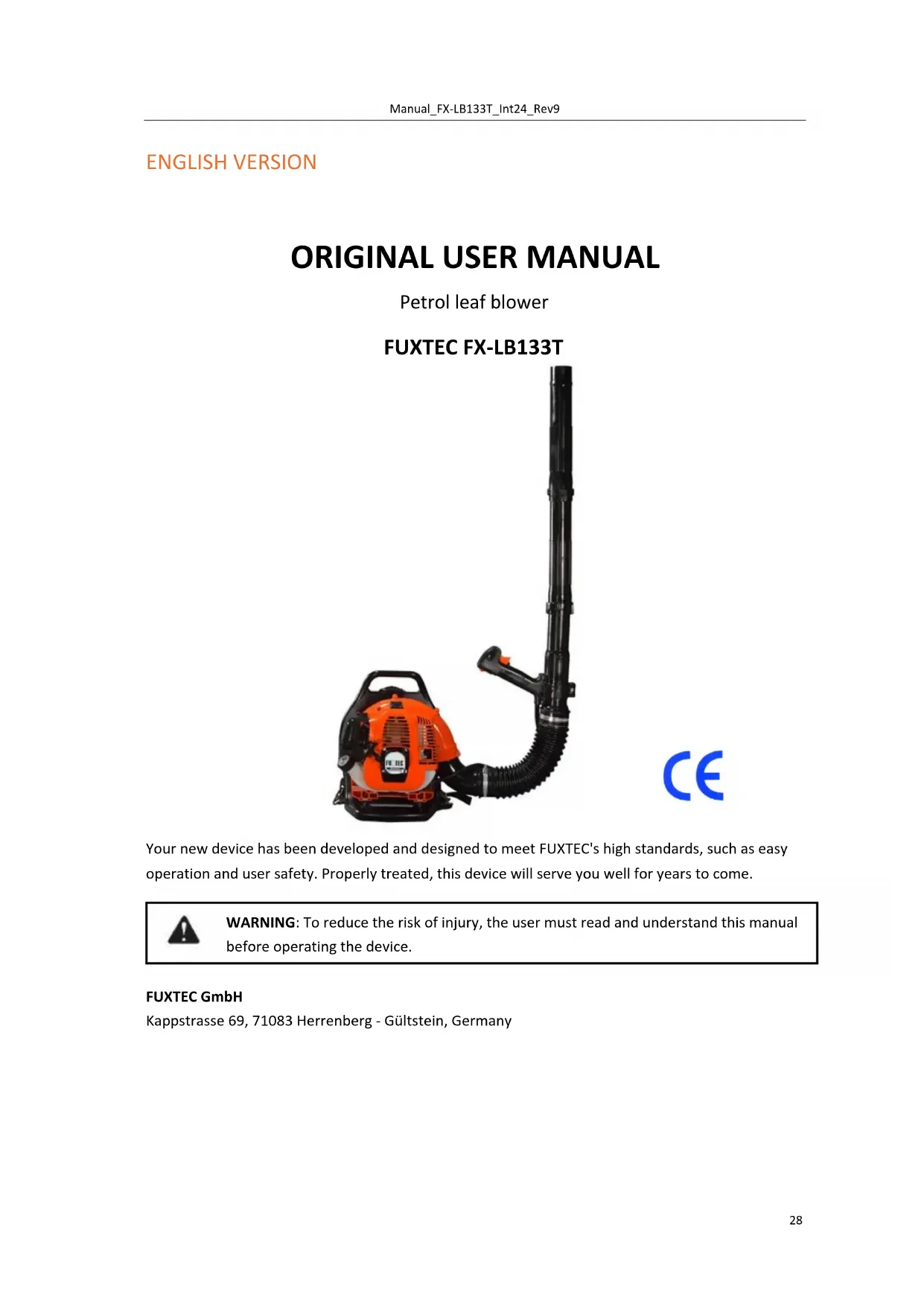 We would like to thank you for purchasing a leaf blower from our company. This user manual will explain how to use the blower in the best possible way. Before using it, please read this manual carefully, operate the device correctly and work safely. Furthermore, it is possible that not all details of your device comply with the operating manual due to further development of the device. Therefore, we ask for your understanding.
