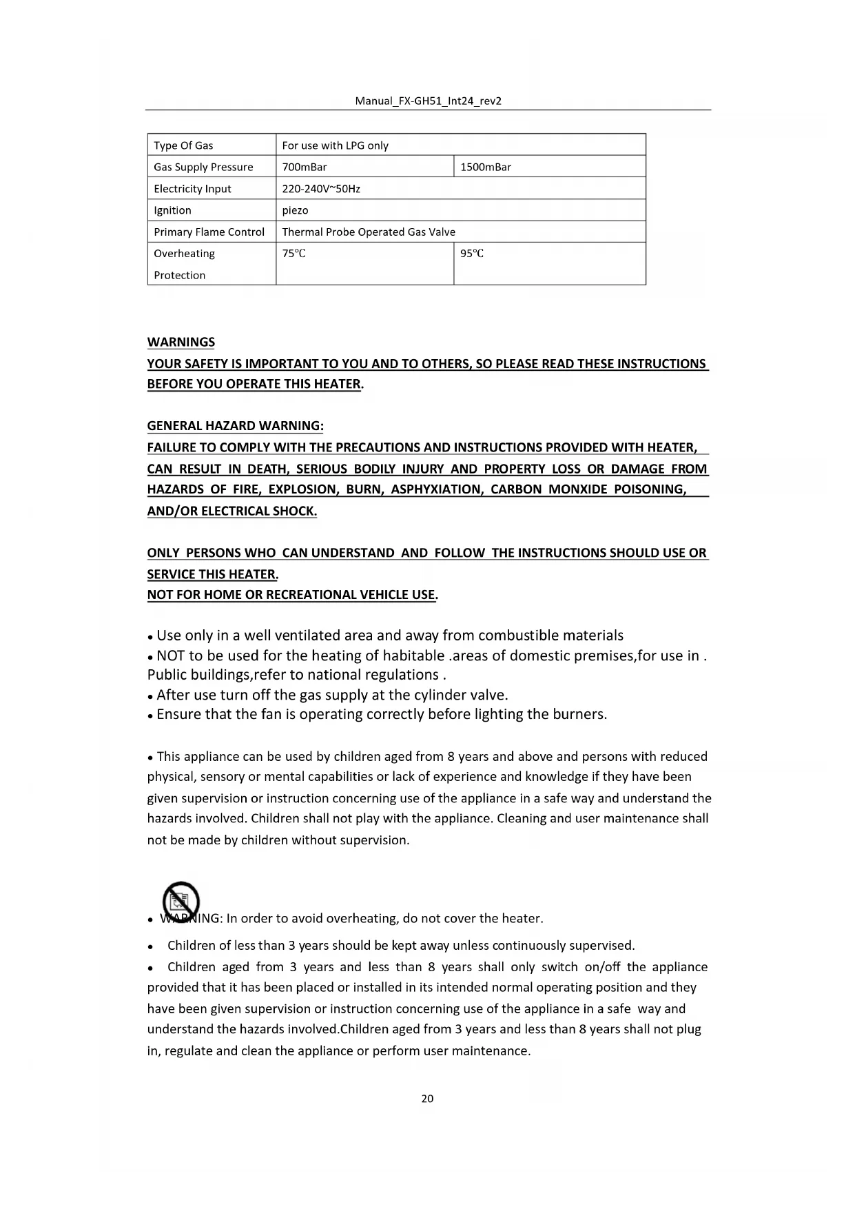 WARNINGS YOUR SAFETY IS IMPORTANT TO YOU AND TO OTHERS, SO PLEASE READ THESE INSTRUCTIONS BEFORE YOU OPERATE THIS HEATER. GENERAL HAZARD WARNING: FAILURE TO COMPLY WITH THE PRECAUTIONS AND INSTRUCTIONS PROVIDED WITH HEATER, CAN RESULT IN DEATH, SERIOUS BODILY INJURY AND PROPERTY LOSS OR DAMAGE FROM HAZARDS OF FIRE, EXPLOSION, BURN, ASPHYXIATION, CARBON MONXIDE POISONING, AND/OR ELECTRICAL SHOCK. ONLY PERSONS WHO CAN UNDERSTAND AND FOLLOW THE INSTRUCTIONS SHOULD USE OR SERVICE THIS HEATER. NOT FOR HOME OR RECREATIONAL VEHICLE USE. ● Use only in a well ventilated area and away from combustible materials ● NOT to be used for the heating of habitable .areas of domestic premises,for use in . Public buildings,refer to national regulations . ● After use turn off the gas supply at the cylinder valve. ● Ensure that the fan is operating correctly before lighting the burners. ● This appliance can be used by children aged from 8 years and above and persons with reduced physical, sensory or mental capabilities or lack of experience and knowledge if they have been given supervision or instruction concerning use of the appliance in a safe way and understand the hazards involved. Children shall not play with the appliance. Cleaning and user maintenance shall not be made by children without supervision. ● WARNING: In order to avoid overheating, do not cover the heater. ● Children of less than 3 years should be kept away unless continuously supervised. ● Children aged from 3 years and less than 8 years shall only switch on/off the appliance provided that it has been placed or installed in its intended normal operating position and they have been given supervision or instruction concerning use of the appliance in a safe way and understand the hazards involved.Children aged from 3 years and less than 8 years shall not plug in, regulate and clean the appliance or perform user maintenance.Manual_FX-GH51_Int24_rev2
