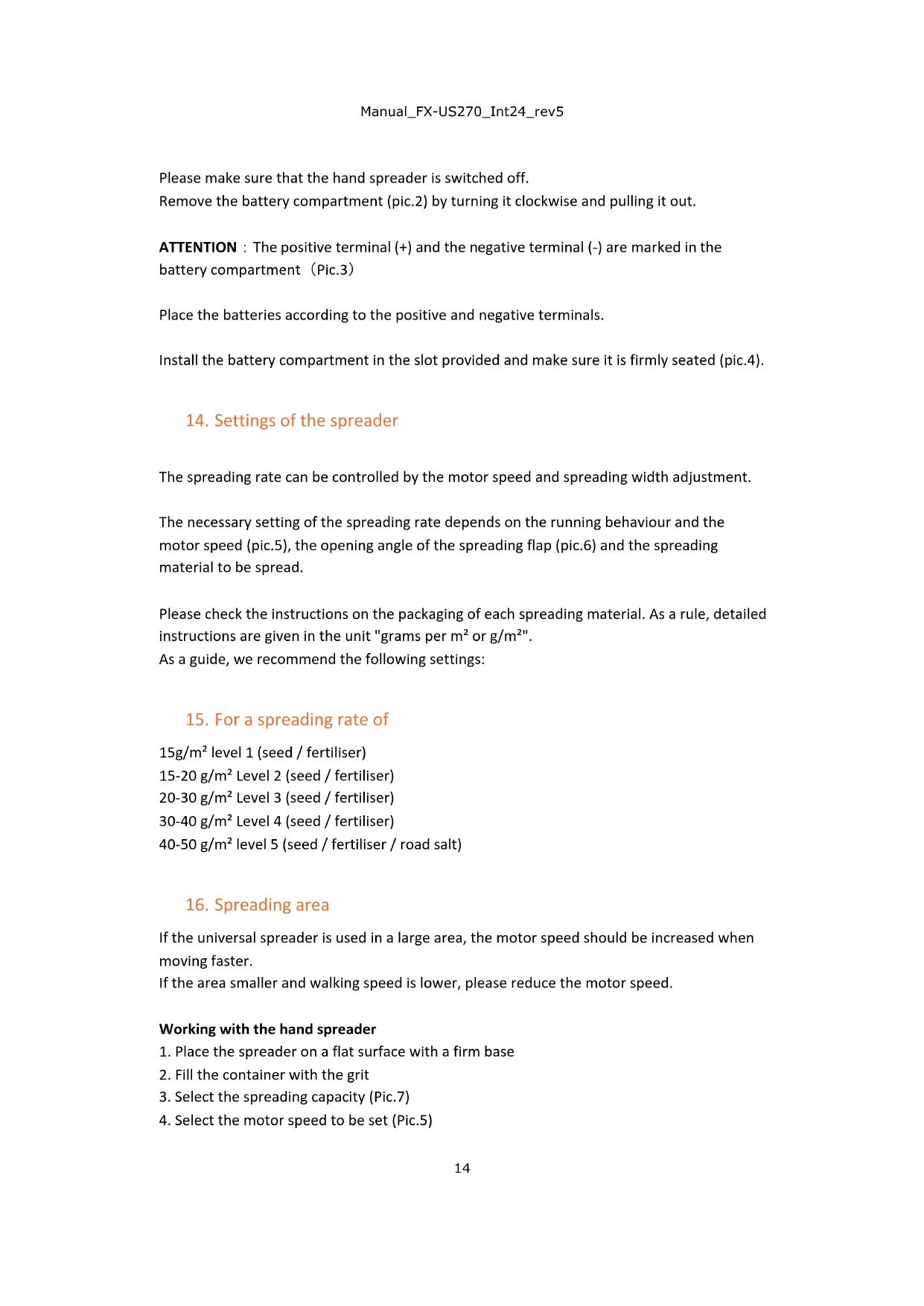 The spreading rate can be controlled by the motor speed and spreading width adjustment. The necessary setting of the spreading rate depends on the running behaviour and the motor speed (pic.5), the opening angle of the spreading flap (pic.6) and the spreading material to be spread. Please check the instructions on the packaging of each spreading material. As a rule, detailed instructions are given in the unit "grams per m² or g/m²". As a guide, we recommend the following settings: