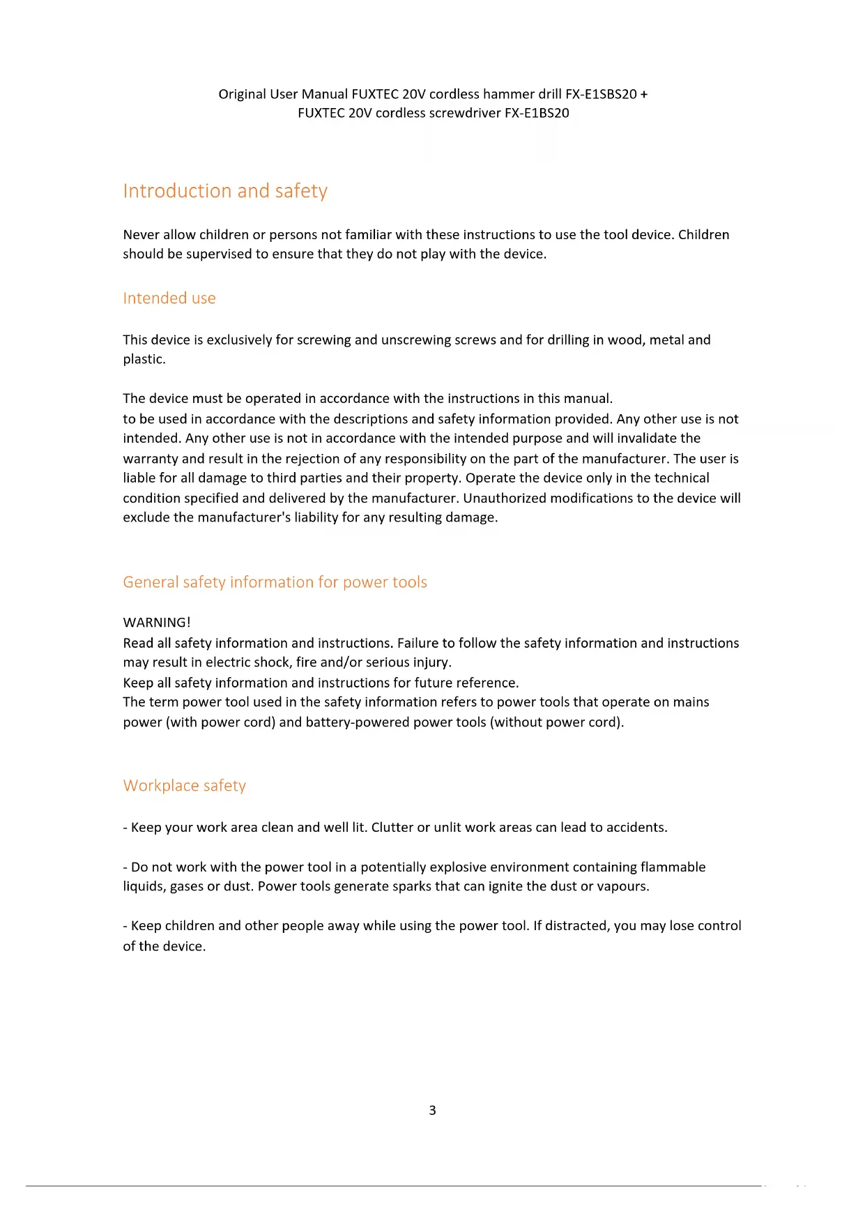 Workplace safety - Keep your work area clean and well lit. Clutter or unlit work areas can lead to accidents. - Do not work with the power tool in a potentially explosive environment containing flammable liquids, gases or dust. Power tools generate sparks that can ignite the dust or vapours. - Keep children and other people away while using the power tool. If distracted, you may lose control of the device.Original User Manual FUXTEC 20V cordless hammer drill FX-E1SBS20 + FUXTEC 20V cordless screwdriver FX-E1BS20